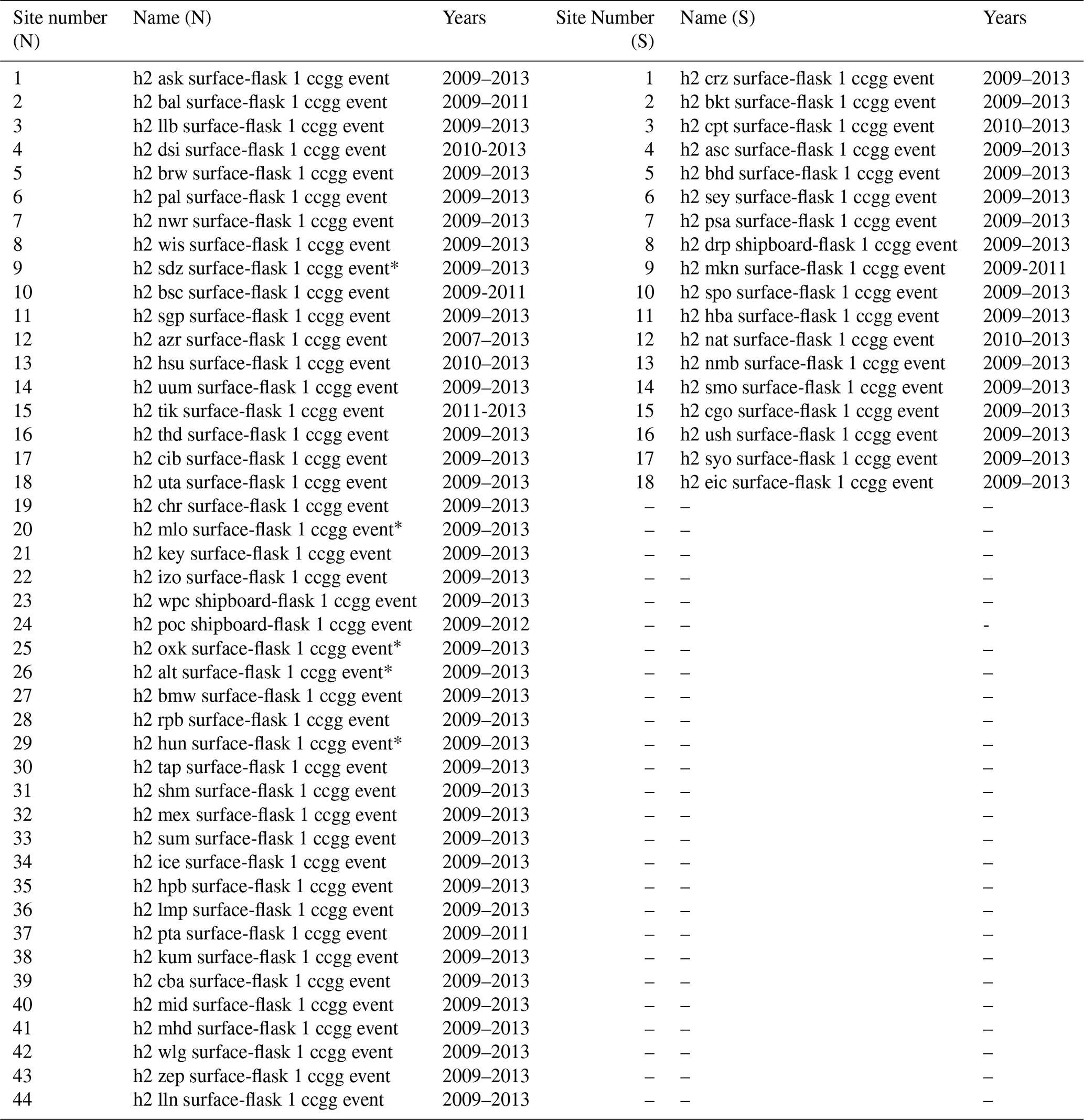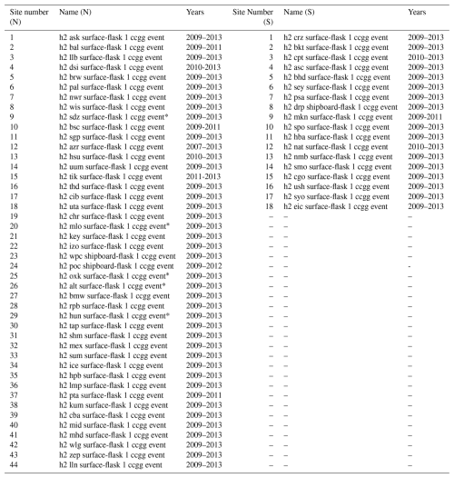 Table A1NOAA observation site for hydrogen divided into north and south. Numbers correspond to the values even in the Taylor diagram (Fig. 5). Values with * do not appear on the Taylor diagram due to either having a negative correlation, or a normalised standard deviation greater than 2.