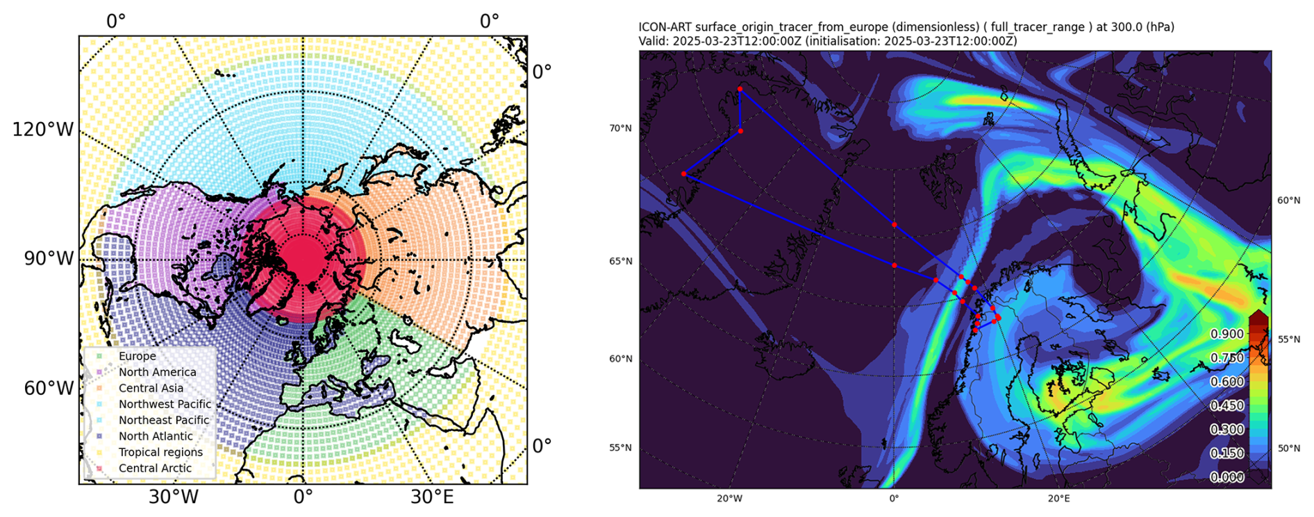 An example usage of those tracers used during the ASCCI campaign is shown in Fig. 1. On the left, the source regions of the tracers are displayed. On the right, the distribution at 300 hPa of the region tracer originating from Europe is shown for 23 March 2025. The simulation was started on 1 December 2024 and reinitialized each day with the current meteorological conditions provided by DWD. In the figure a distinct narrow filament can be seen over the north-west of Scandinavia. The blue lines with red dots depict the corresponding flight path of the research aircraft HALO, where in-situ and remote sampling of the structure has been conducted.