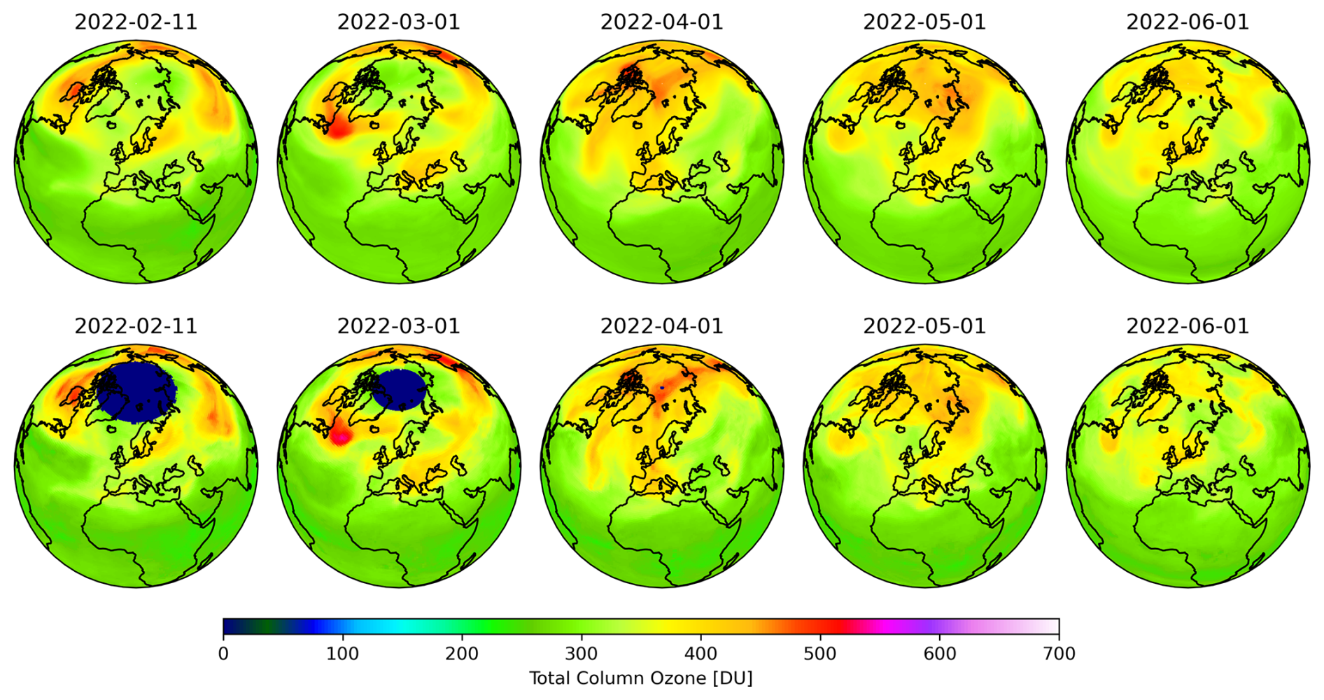 Figure 3Comparison of Ozone Columns Calculated by LINOZ (top) and Satellite Data (bottom). The top row shows a model run that was initialized daily (start date 11 February 2022, 40 km horizontal resolution, 90 height levels) with meteorological reanalysis data by DWD, while ozone was initialized from CAMS EAC4 data (Inness et al., 2019) on 11 February 2022 and then passed on. The bottom row shows satellite data provided by NASA Ozone Watch (NASA, 2025).