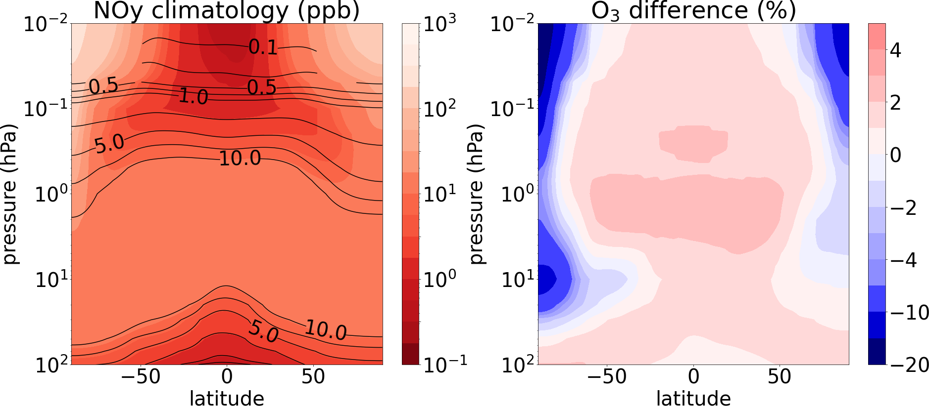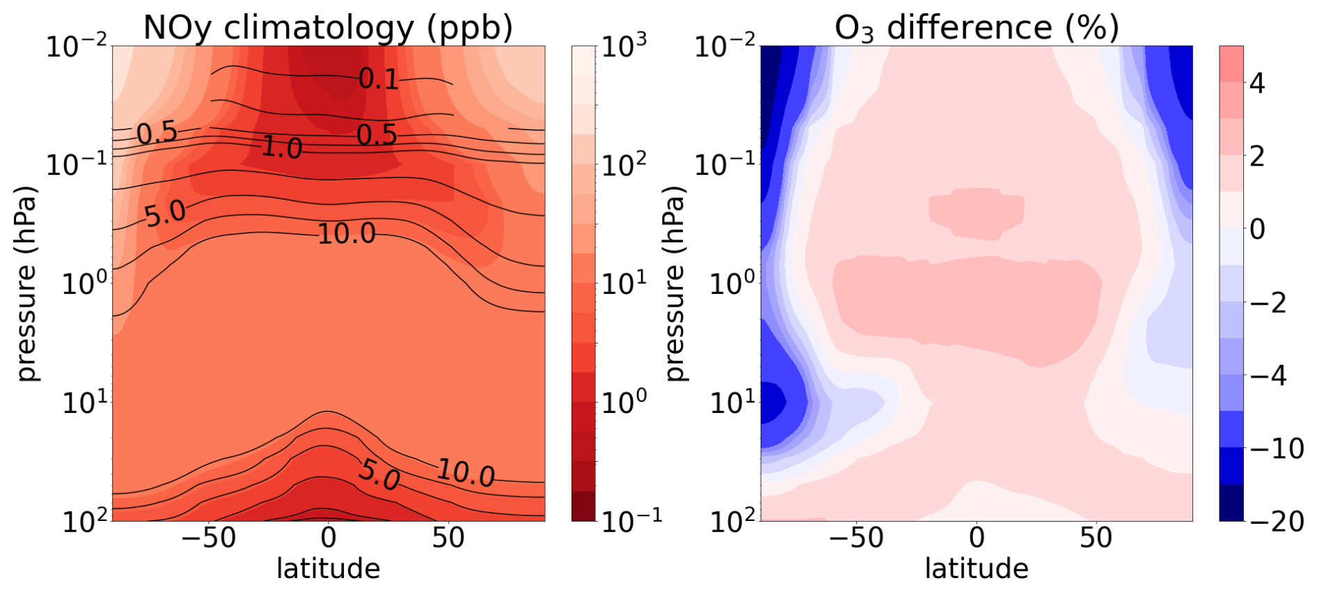 Figure 4Left: NOy averaged over 8 years of model time. Colors: model experiment with variable EPP-NOy for 2002–2009 and constant solar maximum SSI. Lines: no EPP-NOy and constant solar minimum SSI. Right: percentage difference of ozone for the same period and model experiments, highlighting enhanced ozone formation around the tropical stratopause for solar maximum conditions, as well as strong ozone loss in polar regions due to the EPP-NOy. Model experiments following Ramezani Ziarani et al. (2025) using ICON-ART version 2025.10