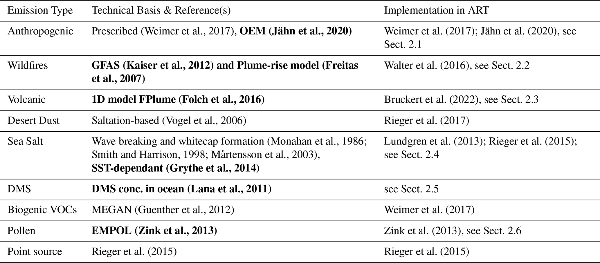 (Weimer et al., 2017)(Jähn et al., 2020)Weimer et al. (2017); Jähn et al. (2020)(Kaiser et al., 2012)(Freitas et al., 2007)Walter et al. (2016)(Folch et al., 2016)Bruckert et al. (2022)(Vogel et al., 2006)Rieger et al. (2017)(Monahan et al., 1986; Smith and Harrison, 1998; Mårtensson et al., 2003)(Grythe et al., 2014)Lundgren et al. (2013); Rieger et al. (2015)(Lana et al., 2011)(Guenther et al., 2012)Weimer et al. (2017)(Zink et al., 2013)Zink et al. (2013)Rieger et al. (2015)Rieger et al. (2015)Table 1Emissions in the ICON-ART model system including the main technical/scientific basis and references of the parameterization and the first published implementation in the ART framework. The new features presented in this work are shown in bold.