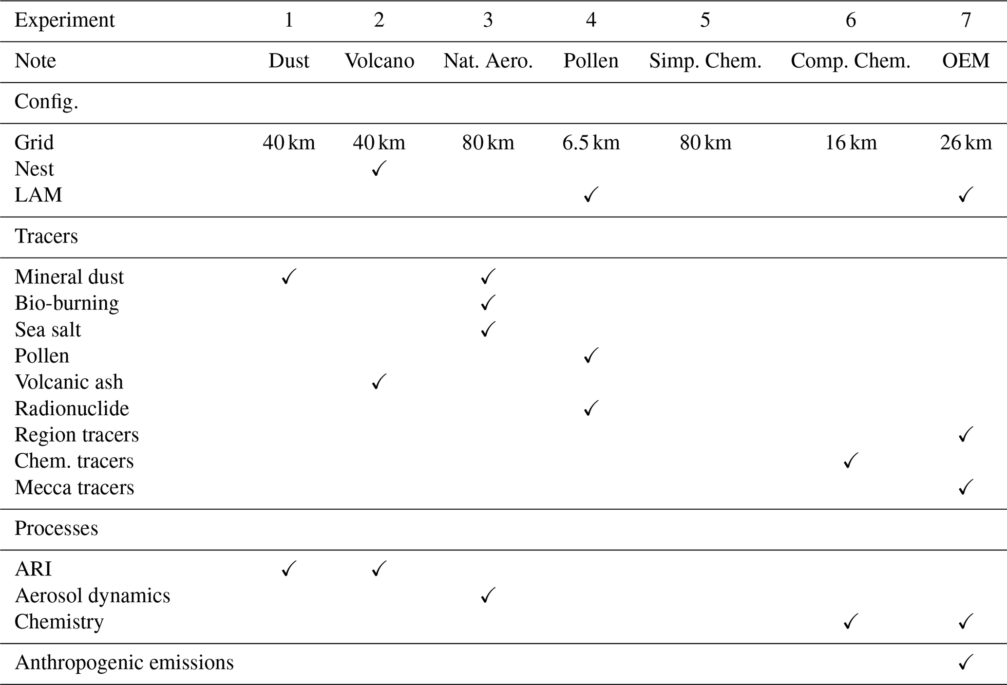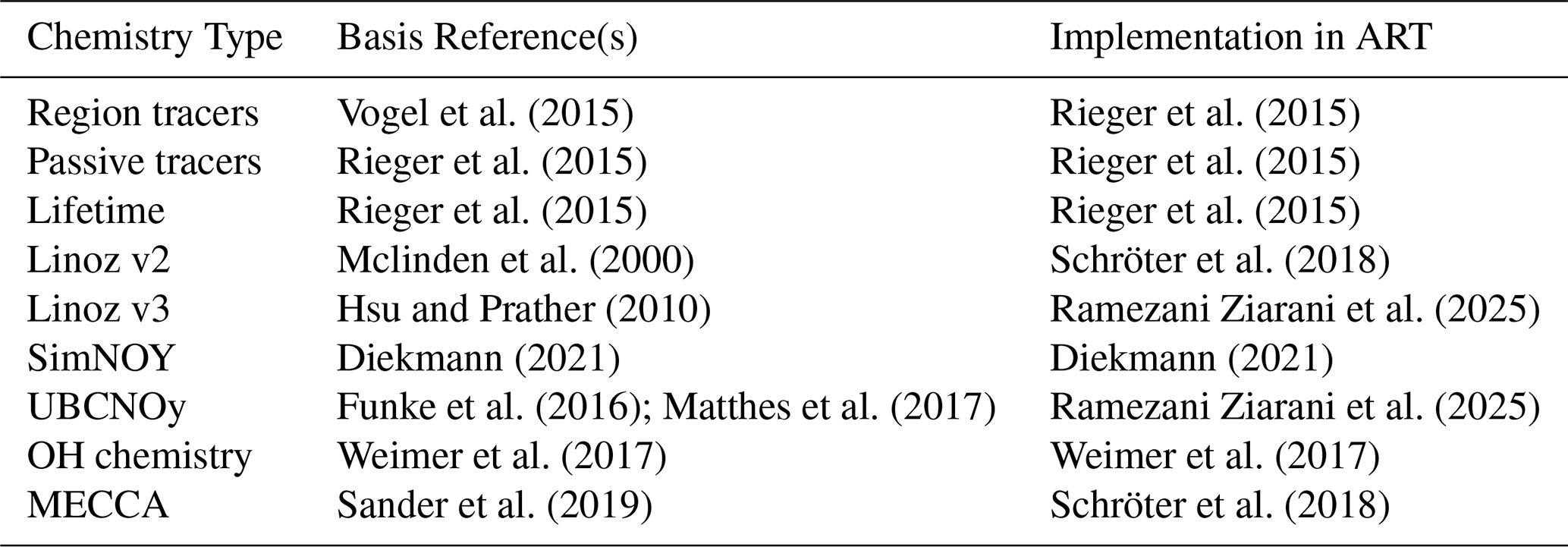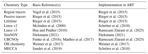 Vogel et al. (2015)Rieger et al. (2015)Rieger et al. (2015)Rieger et al. (2015)Rieger et al. (2015)Rieger et al. (2015)Mclinden et al. (2000)Schröter et al. (2018)Hsu and Prather (2010)Ramezani Ziarani et al. (2025)Diekmann (2021)Diekmann (2021)Funke et al. (2016); Matthes et al. (2017)Ramezani Ziarani et al. (2025)Weimer et al. (2017)Weimer et al. (2017)Sander et al. (2019)Schröter et al. (2018)Table 2Types of chemistry in ART including reference to their main technical/scientific descriptions and the first published implementation in the ICON-ART framework.