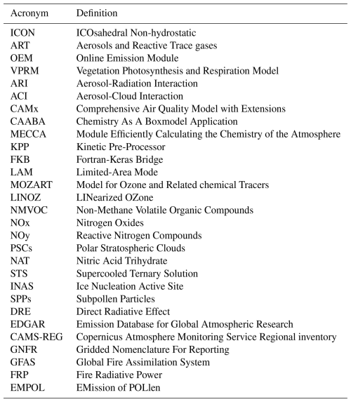 The ICON model has been developed and widely used for weather and climate prediction across scales. It solves the 3D non-hydrostatic and compressible Navier–Stokes equations on an icosahedral-triangular grid (Gassmann and Herzog, 2008), facilitating precise predictions across scales (Zängl et al., 2015; Heinze et al., 2017; Giorgetta et al., 2018). The ART module, integrated into the ICON framework, enables comprehensive modeling of atmospheric composition. It handles emissions, transport, and transformations of trace gases and aerosols, incorporating gas-phase chemistry and aerosol dynamics in the troposphere and stratosphere (Rieger et al., 2015; Weimer et al., 2017; Schröter et al., 2018). ICON-ART has been successfully used to investigate mutual feedbacks between the chemical and physical states of the atmosphere across different scales ranging from large-eddy simulations (Muth et al., 2025) to regional weather (Rieger et al., 2017; Seifert et al., 2023) and global climate (Weimer et al., 2021). While ICON can be coupled to external aerosol and chemistry models, ART represents the natively and fully integrated atmospheric composition component developed and maintained within the ICON modeling framework.