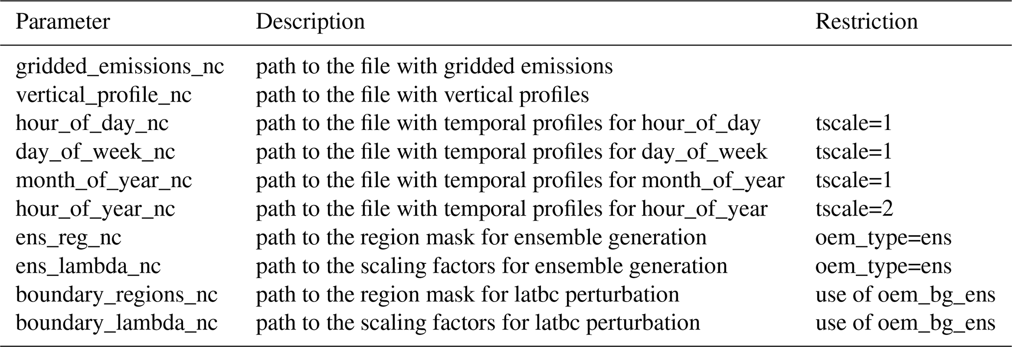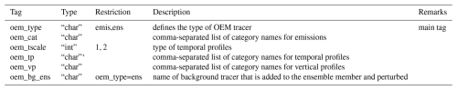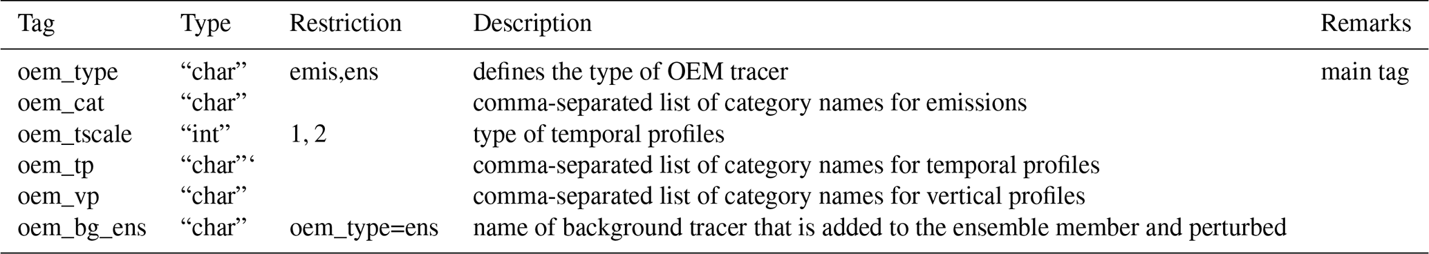 In addition to temporal and vertical factors, it may be necessary to provide speciation factors, which describe the fractional contribution of individual model species X to the total emissions of a family of species in the inventory. Examples are non-methane volatile organic compounds (NMVOC) and nitrogen oxides (NOx), for which inventories typically provide only the total emissions of the family but not of the individual compounds. Speciation factors cannot be supplied as input to OEM, but are dealt with by emiproc. Based on an emission field for the family and a set of speciation factors, emiproc generates and writes out emission fields for all model species X. XML tags and namelist settings for OEM are described in Appendix E.