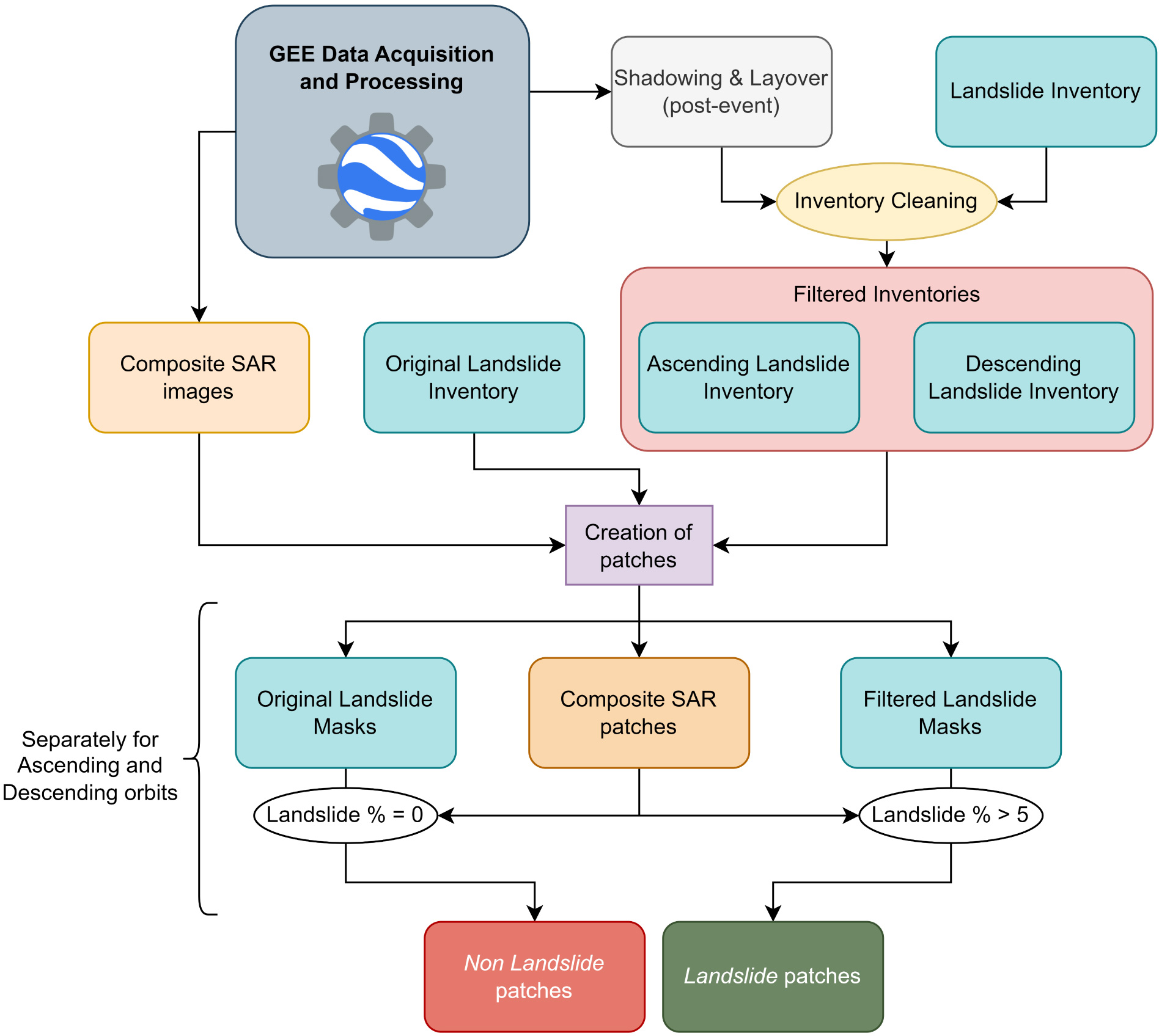 Landslide polygons in the available inventories were digitized from optical imagery. Because of geometric distortions inherent to SAR, particularly layover and shadowing in mountainous terrain (Soldato et al.2021; Burrows et al.2020; NASA Earthdata2025), we design a tailored sampling strategy. Following Vollrath et al. (2020) and Lindsay et al. (2022), we generated shadow and layover masks for each acquisition geometry and subtracted them from the landslide inventories (“Inventory Cleaning” in Fig. 1). Three inventories were thus prepared for each study case: (i) original, (ii) filtered with ascending masks, and (iii) filtered with descending masks. The original inventory was used for sampling the background class, while filtered inventories were used for landslide samples, retaining only patches with more than 5 % landslide pixels ( 2000 m2). Predictions in patches below this threshold are treated as false positives, acknowledging that some of them may correspond to real but sub-threshold or unmapped landslides.