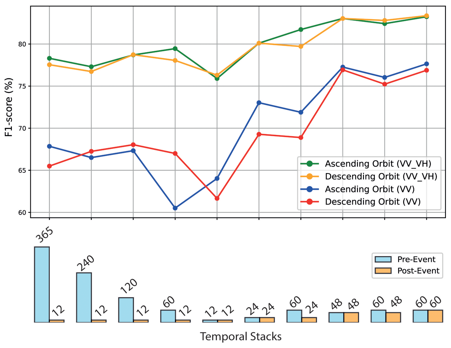 Figure 2Performance of models trained on different pre- and post-event temporal stacks, considering both ascending and descending orbits and utilizing VV and VV_VH data combinations.