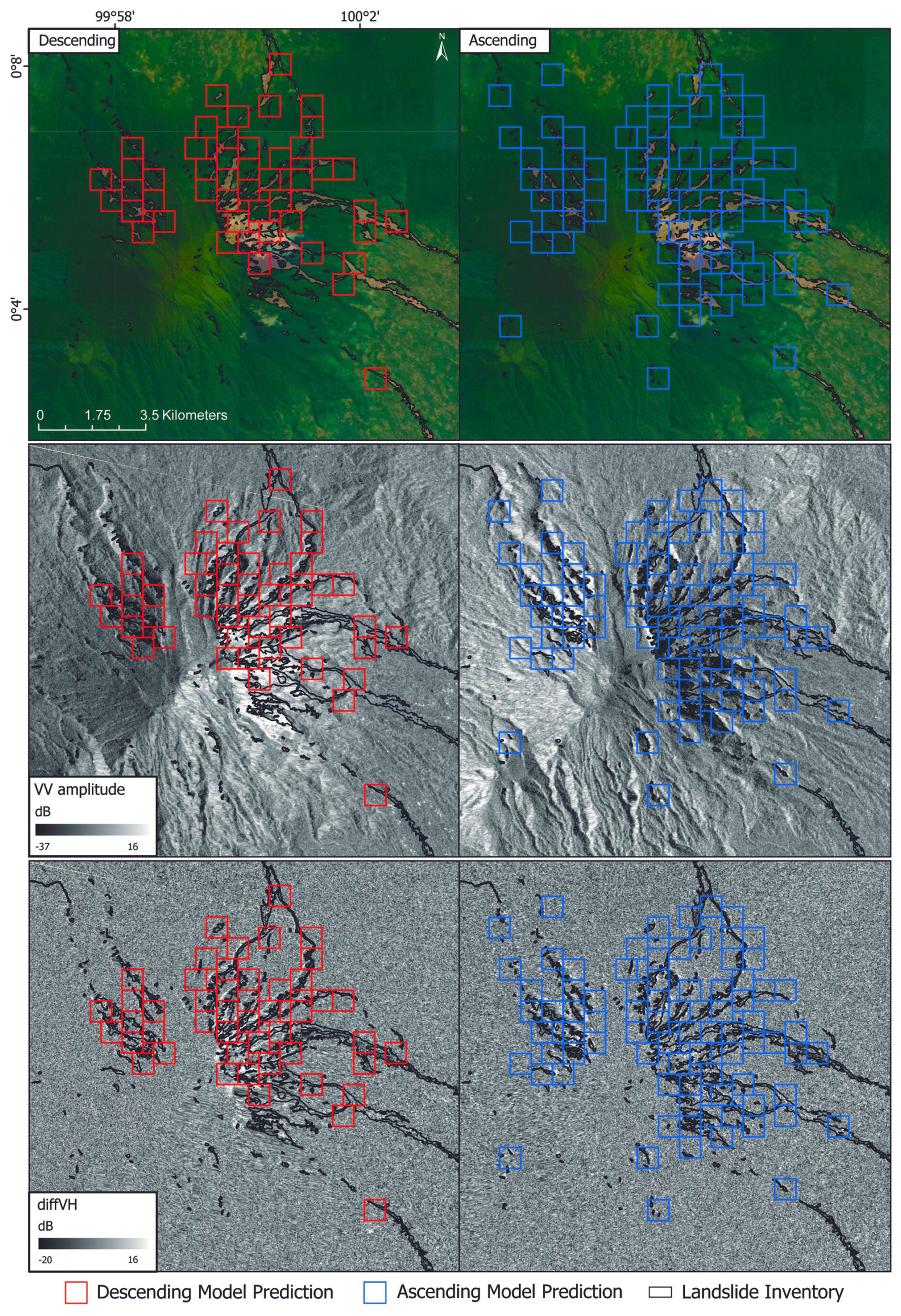 Figure 3Rapid assessment for the 2022 Sumatra event utilizing VV_VH combination and 60-12 stack pre- and post-event. This unseen event validates the comprehensive generalizability in the rapid assessment of the VV_VH-based detection models. The left column shows the predictions obtained using the descending orbit, while the right shows the predictions based on the ascending orbit. The first row shows the predictions over an RGB background, the second row uses a post-event VV background, and the third row displays the diffVH background.