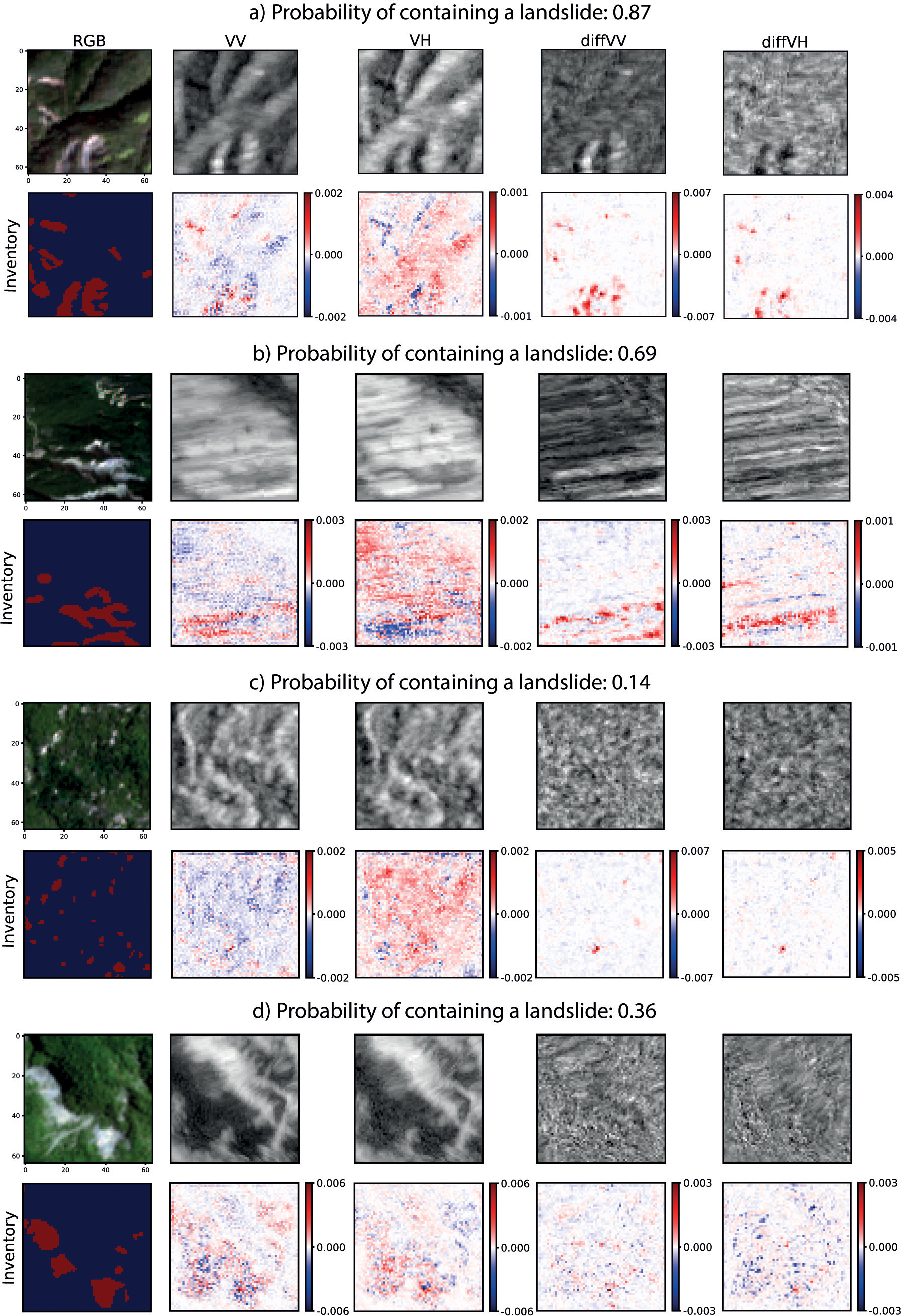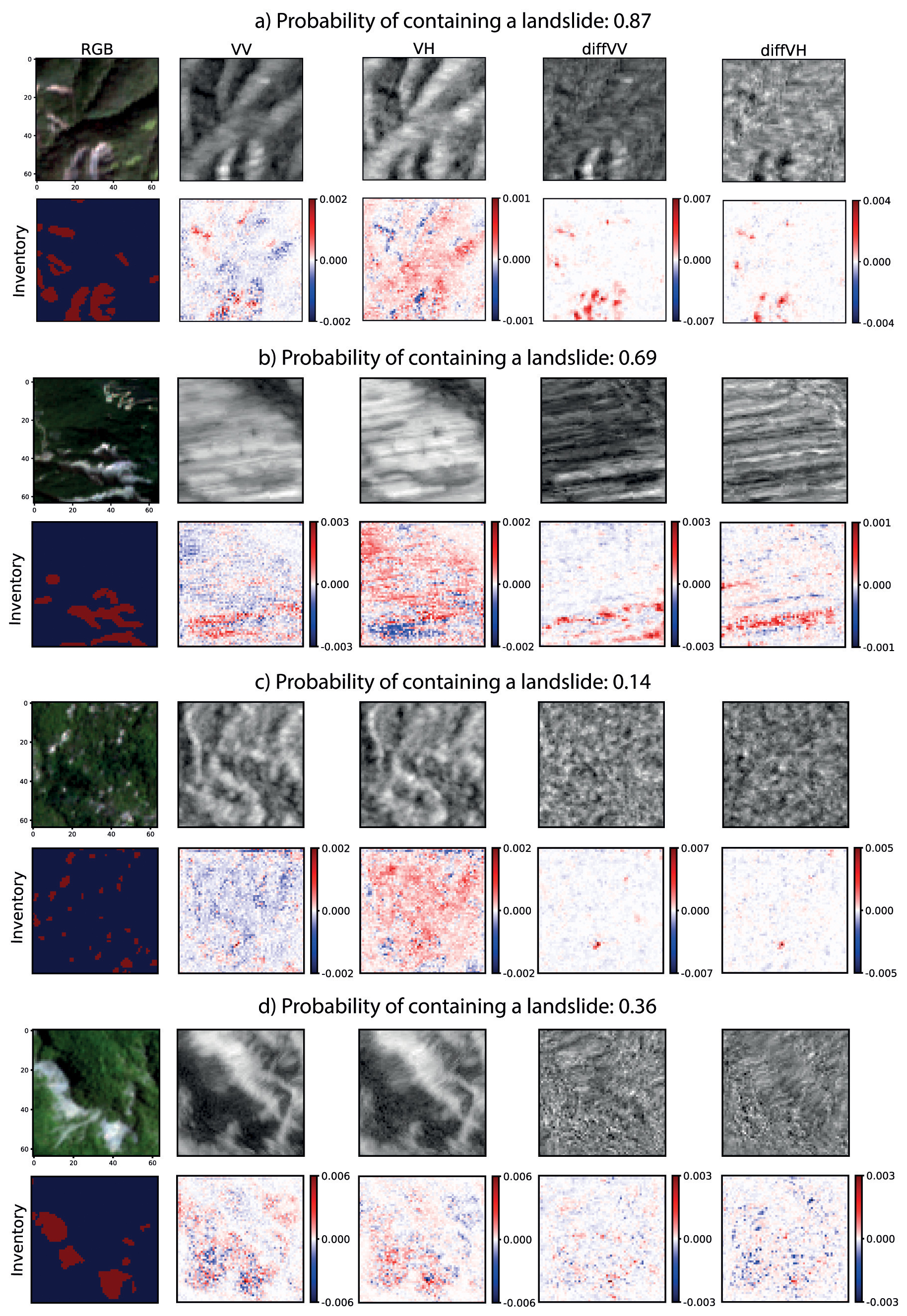 Figure 6 shows relative pixel contributions. Within these examples, we present four patches where the model assigns a high probability (0.87) of belonging to the landslide class in two instances. While post-event VV imagery maintains this emphasis, post-event VH imagery often shows pixels contributing to increased landslide probability without displaying the landslides themselves. This pattern persists across all VH band cases, suggesting the model uses VH for contextual insights. Despite VV and VH having minor weight in the final model decision, they cleaerly play crucial roles when combined with more impactful features like diffVV and diffVH. The performance gain in VV_VH models mainly reflects the complementary nature of the two polarizations: VV enhances sensitivity to surface roughness and moisture, while VH captures vegetation-related volume scattering, allowing the model to distinguish landslides from background more effectively.