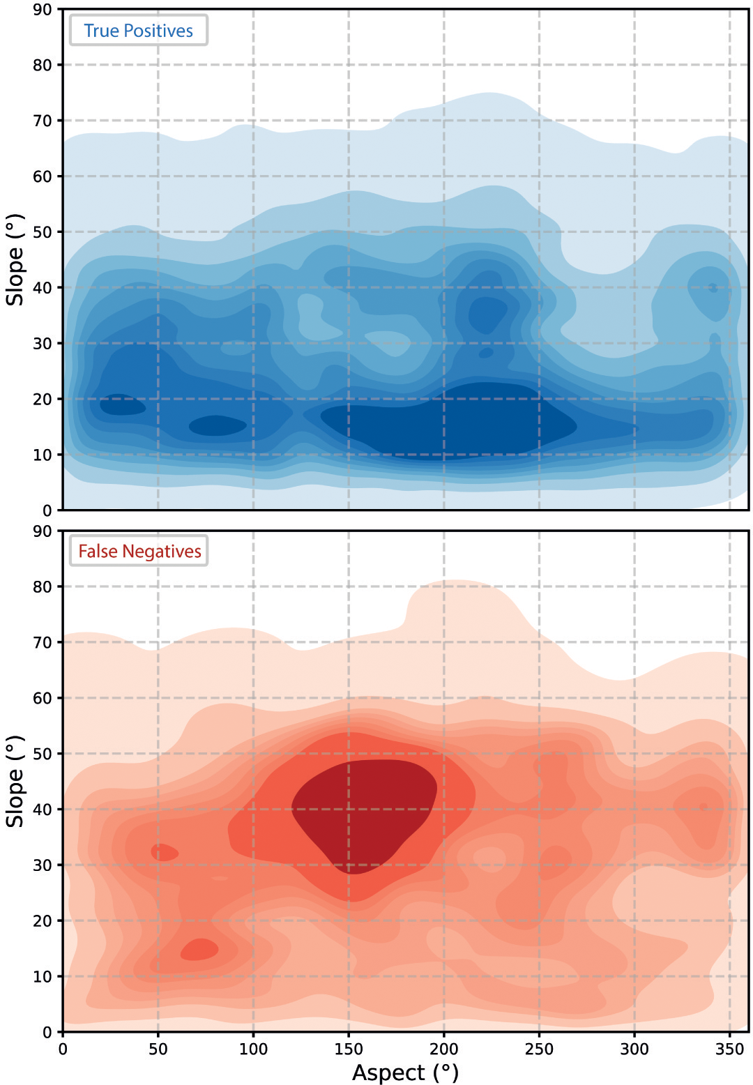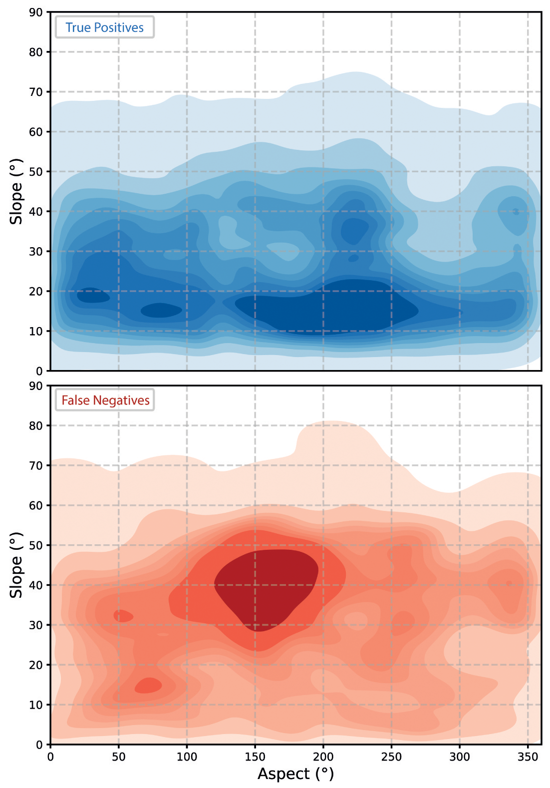 The models seems to have higher error rates in herbaceous and open forest areas. These likely reflect a combination of increased backscatter variability, partial canopy effects, and inventory limitations, which together make landslides harder to detect reliably in these environments (see Fig. S2). However, we observed a discrepancy in the distribution of slope and aspect values when comparing the pixels within landslide scars of patches correctly predicted as landslides (True Positives) with those where landslides were missed (False Negatives). In True Positives, the distributions of slope and aspect align with the overall distribution observed in landslide scars across the entire training set (see Fig. S1), indicating that the model performs well when detecting landslides that align with these typical distributions. However, considering False Negatives, the distributions diverge, particularly in areas with high slope degrees (see Fig. 7).