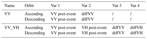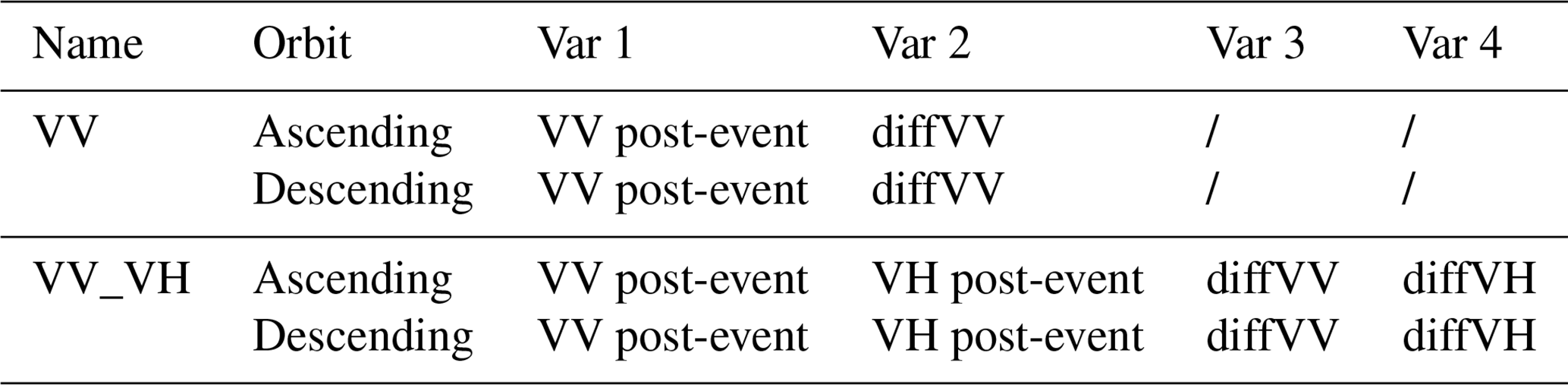 Table 2Main Dataset Combinations. diffVV and diffVH are obtained by subtracting the median of the pre-event stack from the median of the post-event stack.