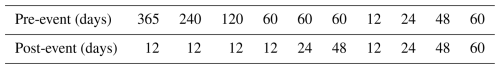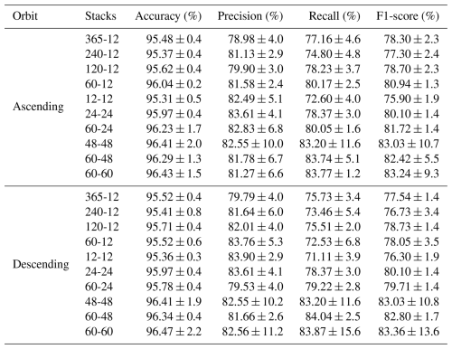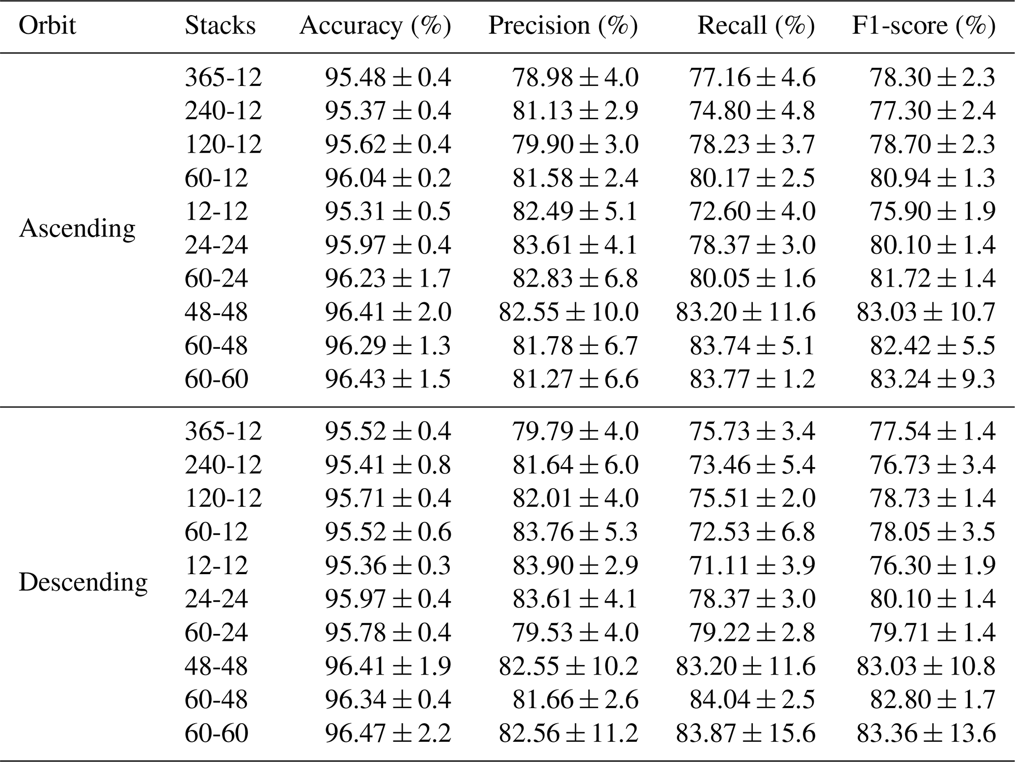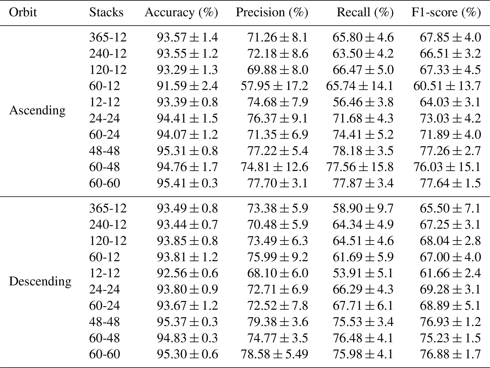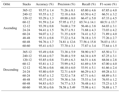 Furthermore, these four major combinations are implemented across various pre- and post-event temporal buffers. The selection of these buffers is based on the current average revisiting time of Sentinel-1. The 12 d buffer represents the most rapid assessment time, encompassing one acquisition per acquisition geometry, which will fall within 12 d of the event (European Space Agency/Copernicus2025). We vary the selection of such event buffers to assess their impact on model performance (see Table 3).