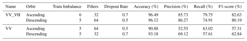 Table 4Hyperparameters and performance of models for rapid assessment using VV and VV_VH combinations for ascending and descending orbits. All models use a 60 d pre-event and 12 d post-event stack with a learning rate of 0.001. Lower VV scores reflect the inclusion of additional study cases (Gorka, Kaikoura, Capellades).