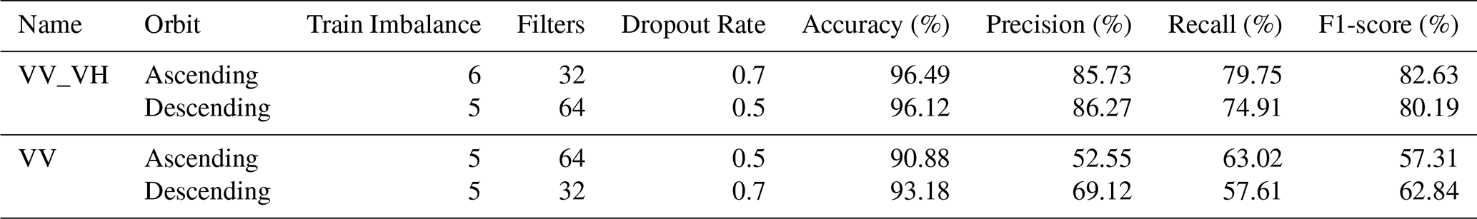 We trained CNN models for each dataset combination: 2 polarization options, 2 orbits (Table 2), and 10 temporal windows (Table 3), yielding 40 models in total. Additional benchmarks compared CNN, CBAM, and ResNet on the VV_VH dataset. ResNet achieved the highest accuracy (96.43 %) and F1-score (82.53 %), while CBAM produced competitive results. The lightweight CNN, however, was selected for large-scale experiments because it balances accuracy (96.04 %) and F1-score (80.94 %) with lower computational cost, making it a practical baseline for extensive testing (see Appendix and Supplement).