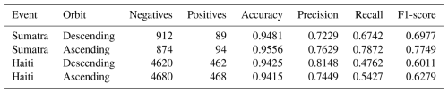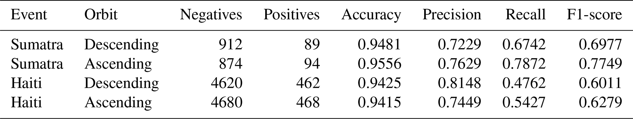 Table 5 summarizes the quantitative performance for the Sumatra and Haiti events across both orbits. Model transferability to the Sumatra event is good, while performance in Haiti decreases, particularly in terms of recall.