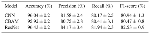 Table A1Performance Metrics of CNN, CBAM, and ResNet Architectures on 60-12 VV_VH Dataset.