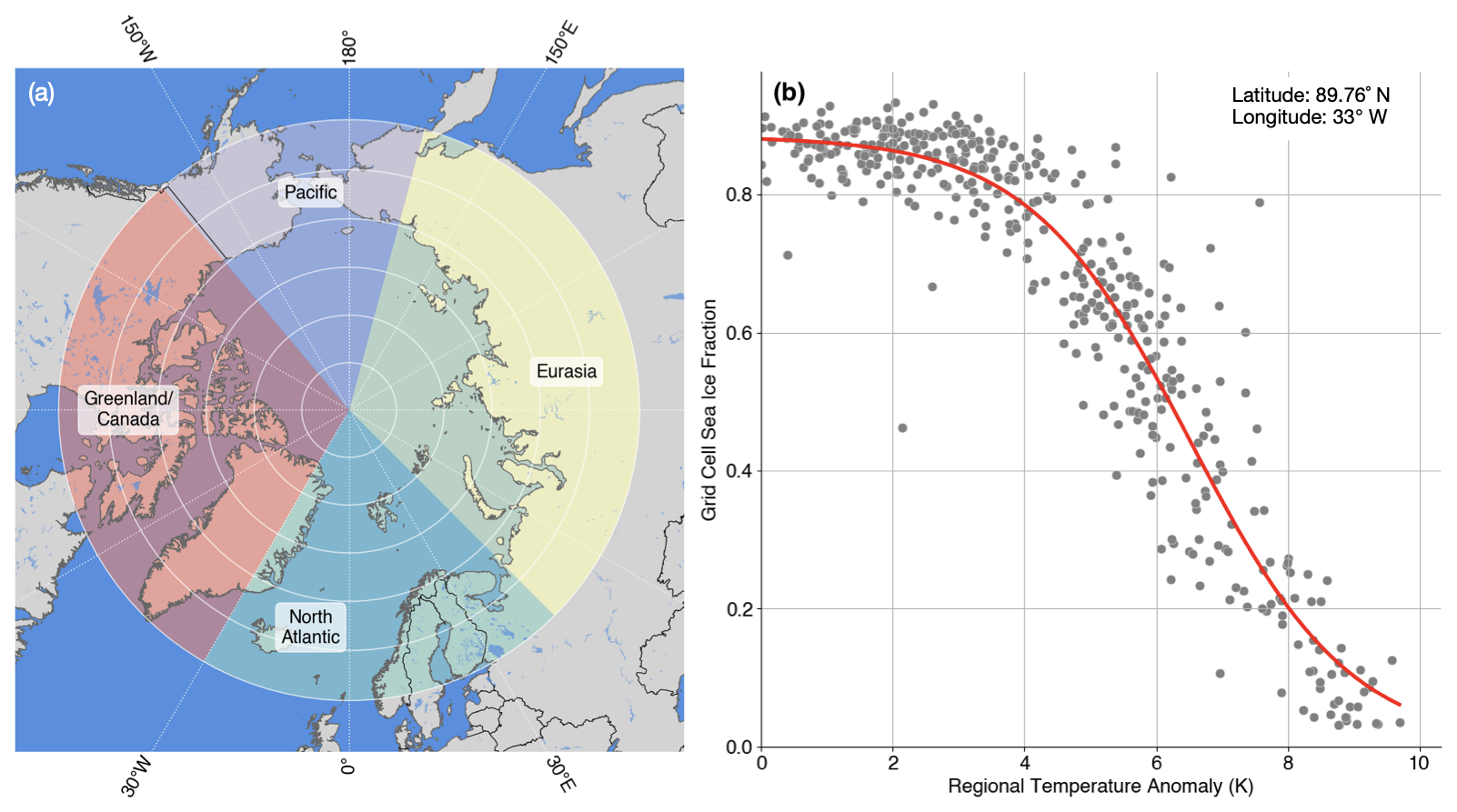 Figure 2Regional subdivision and example logistic fit for Arctic sea ice emulation. (a) The Arctic region (60 to 90° N) is divided into 24 domains based on four longitudinal sectors (Pacific Ocean, Atlantic Ocean, Eurasia, and Greenland/Canada) and six latitudinal bands (60–65, 65–70, 70–75, 75–80, 80–85, and 85–90° N). Each region is used to calculate spatially averaged temperature anomalies that serve as the predictor variable for the logistic function. (b) Example of a logistic function fit (solid line) to annual September sea ice fraction values (points) for a single grid cell. The x axis shows the regional temperature anomaly relative to pre-industrial (1850–1900) baseline, and the y axis shows the September sea ice fraction. The logistic function captures the nonlinear transition from ice-covered to ice-free conditions as regional temperatures increase.