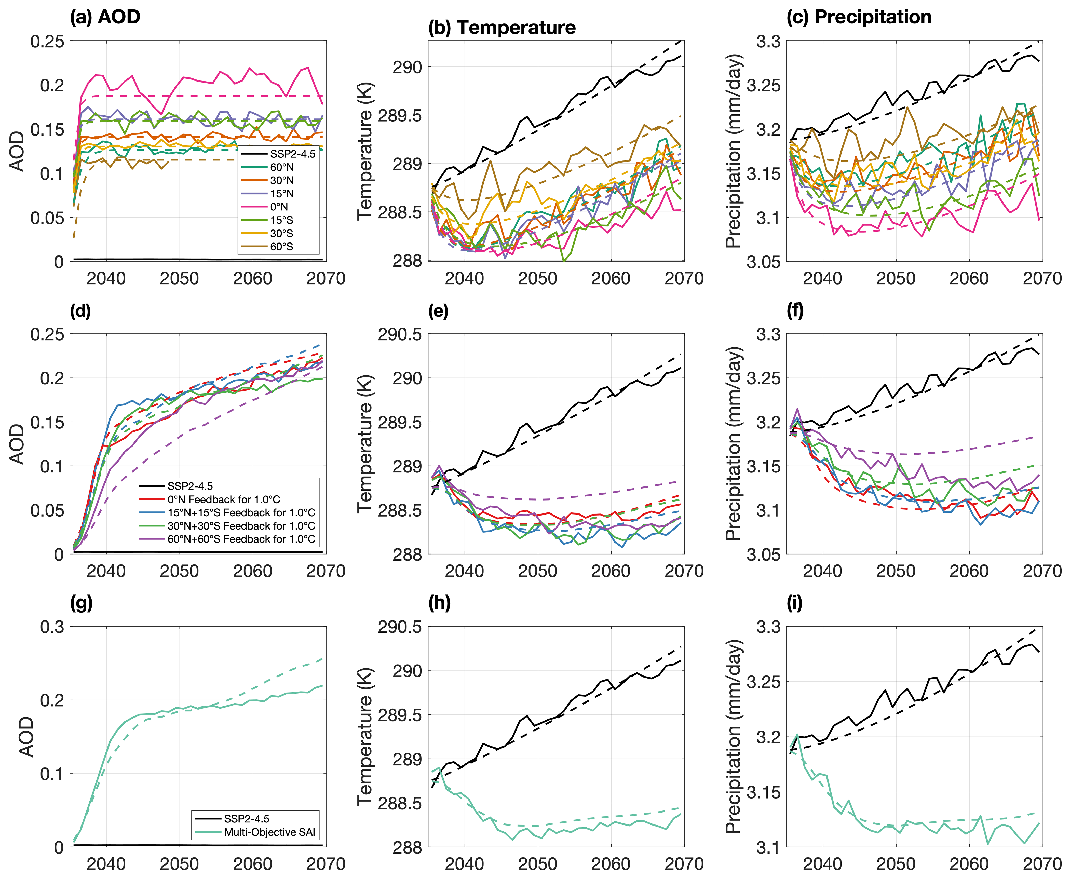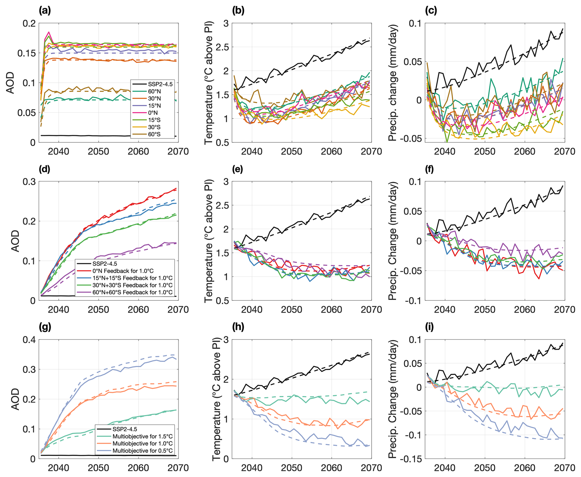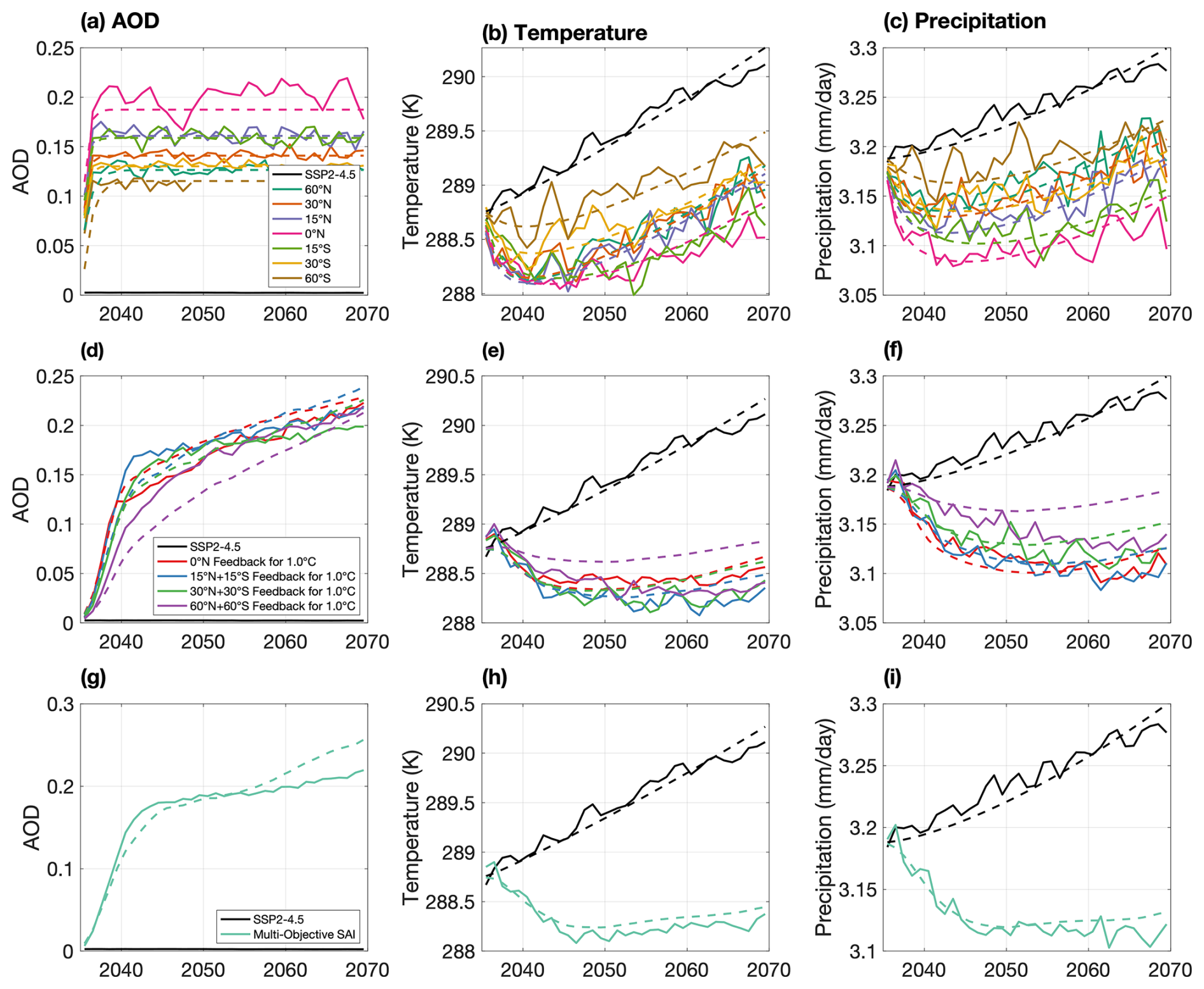 Figure 5Time series from start of SAI deployment (2035) to simulation end (2069) of the UKESM1 (solid line) global mean responses of AOD (a, d, g), temperature (b, e, h), and precipitation (c, f, i), and CIDER emulations of the same (dashed line). Plots (a), (b), and (c) show the responses of the fixed injection, plots (d), (e), and (f) show the responses of the symmetric injection runs for 1.0 °C above PI, and plots (g), (h), and (i) show the responses of the multi-objective run.