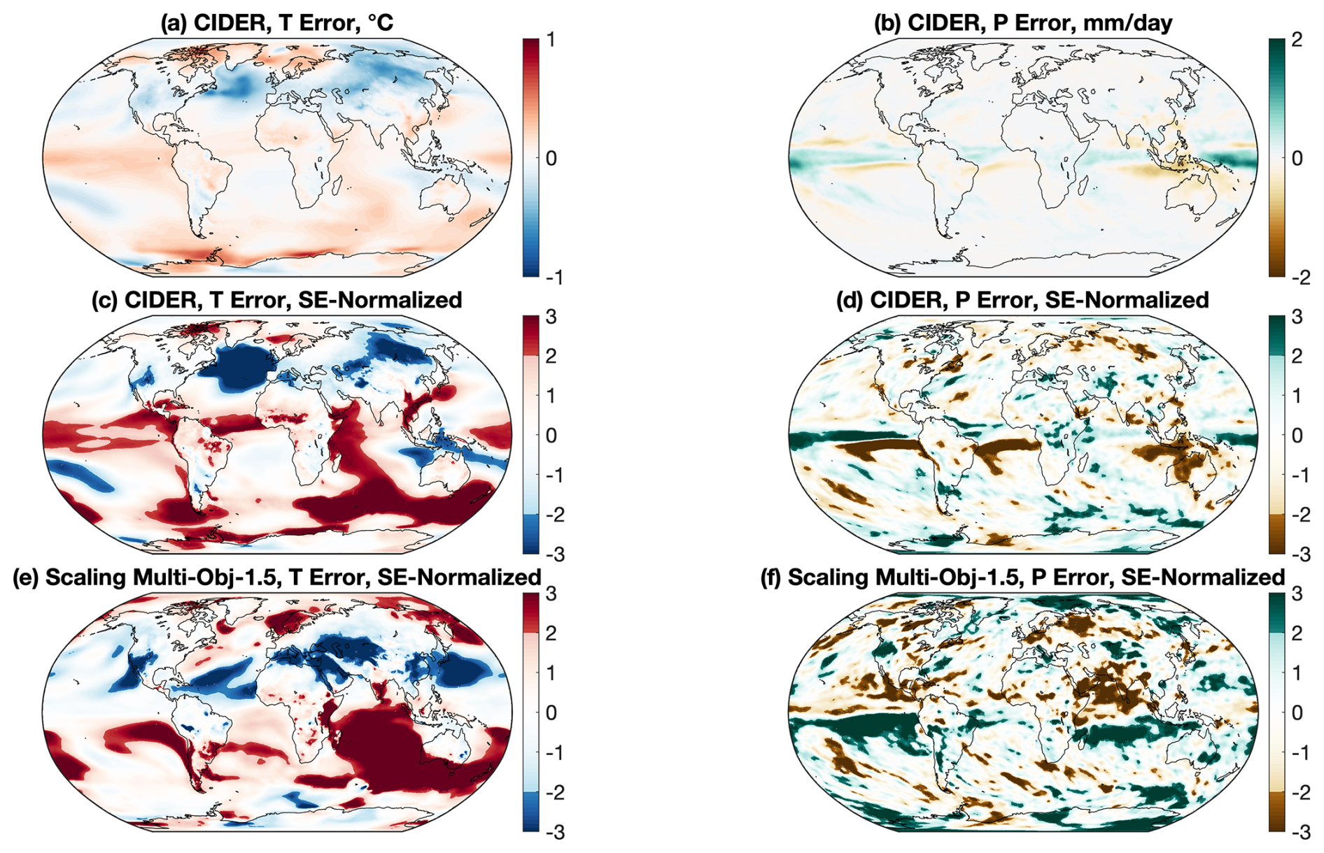 Figure 4Error in pattern matching the multi-objective for 1.0 °C above PI scenario. A difference (CESM2-WACCM6 3-member ensemble – CIDER emulation) was taken over the last 20 years of the scenario (2049–2069) for temperature (a, c) and precipitation (b, d). For plots (c) and (d), the values in plots (a) and (b) were divided by the standard error of temperature (a) and precipitation (b) over the last 20 years at each grid cell (SE-Normalized). Grid cells less than two standard errors from the norm are whitened. For plots e and f, the pattern of cooling for the multi-objective for 1.5 °C above PI scenario was scaled by CIDER's global mean cooling and then subtracted in a similar manner to (c) and (d) to provide a comparison.