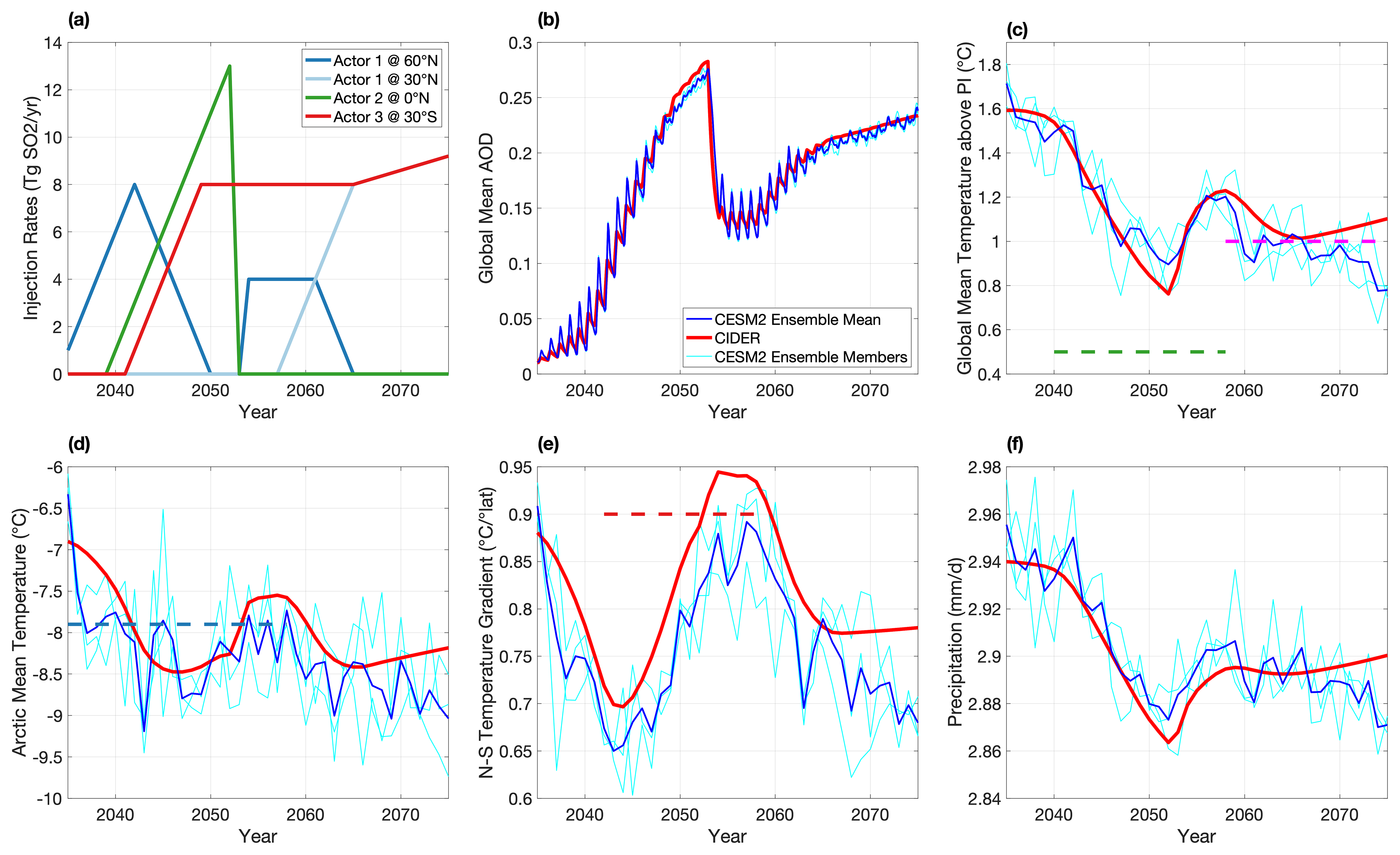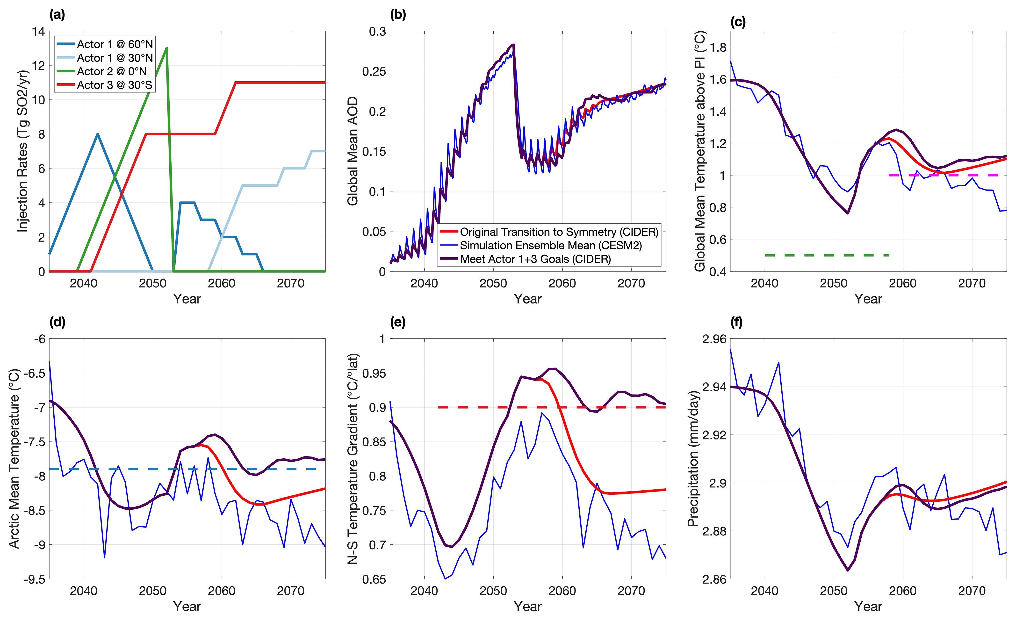 Figure 6Time series associated with the example multi-actor uncoordinated scenario, simulated in CESM2-WACCM6 and emulated with CIDER. The time series start with SAI's deployment in 2035 and continue until the end of the simulation in 2075. (a) The annual injection rates to accomplish the goals set in Table 2. (b) Global mean AOD. A sharp drop occurs following Actor 2's termination in 2053. (c) Global mean temperature. Dashed green line indicates Actor 2's goal (which is not met prior to their termination), and dashed magenta line indicates Actor 1 + 3's coordinated goal for 2055–2075. Note the sharp but limited increase in temperatures resulting from Actor 2's termination. (d) Arctic mean temperature. The dashed blue line indicates Actor 1's goal. Note the minor overcooling that occurs because Actor 1 does not phase out quick enough during Actor 2's phase-in. (e) NS temperature gradient (as defined in Kravitz et al., 2016). The dashed red line represents Actor 3's goal. The gradient quickly lowers as Actor 1 deploys in the Arctic, and it rises again as both Actor 3 deploys at 30° S and Actor 1 phases out to maintain 2020 Arctic temperature (rather than over-cooling). (f) Global mean precipitation. Global mean precipitation was no one's target during this simulation.