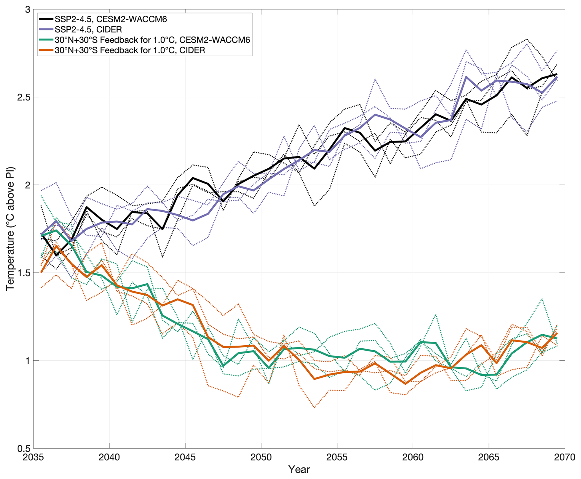 Figure 7Adding interannual variability to the emulation time series. Variability is taken from a random subset of simulation of pre-industrial conditions, removing the mean, and then added onto CIDER's emulation. The solid lines are three-member ensemble means of the CESM2-WACCM6 simulations and CIDER emulations; the dotted lines of the same color are the corresponding individual members.