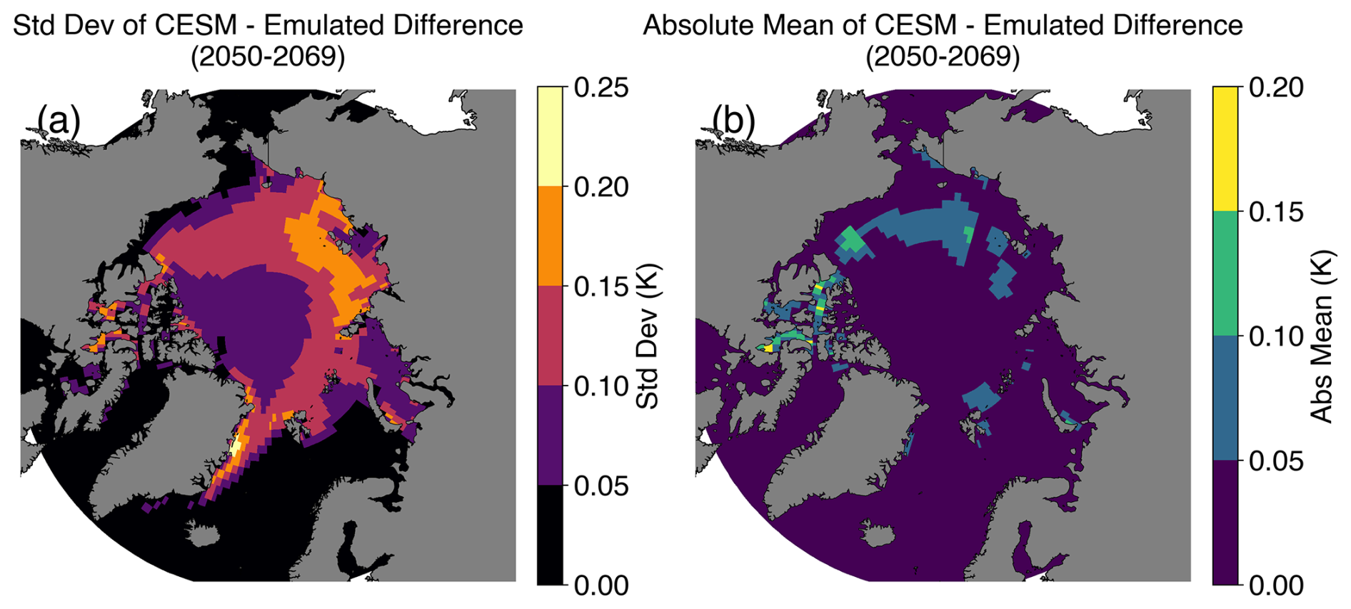 Figure A5Spatial distribution of the error for Arctic sea ice emulation. Maps showing (a) the standard deviation of CESM – Emulated sea ice fraction for 20 years (2050–2069), and (b) the absolute mean of CESM – Emulated sea ice fraction for 20 years (2050–2069).