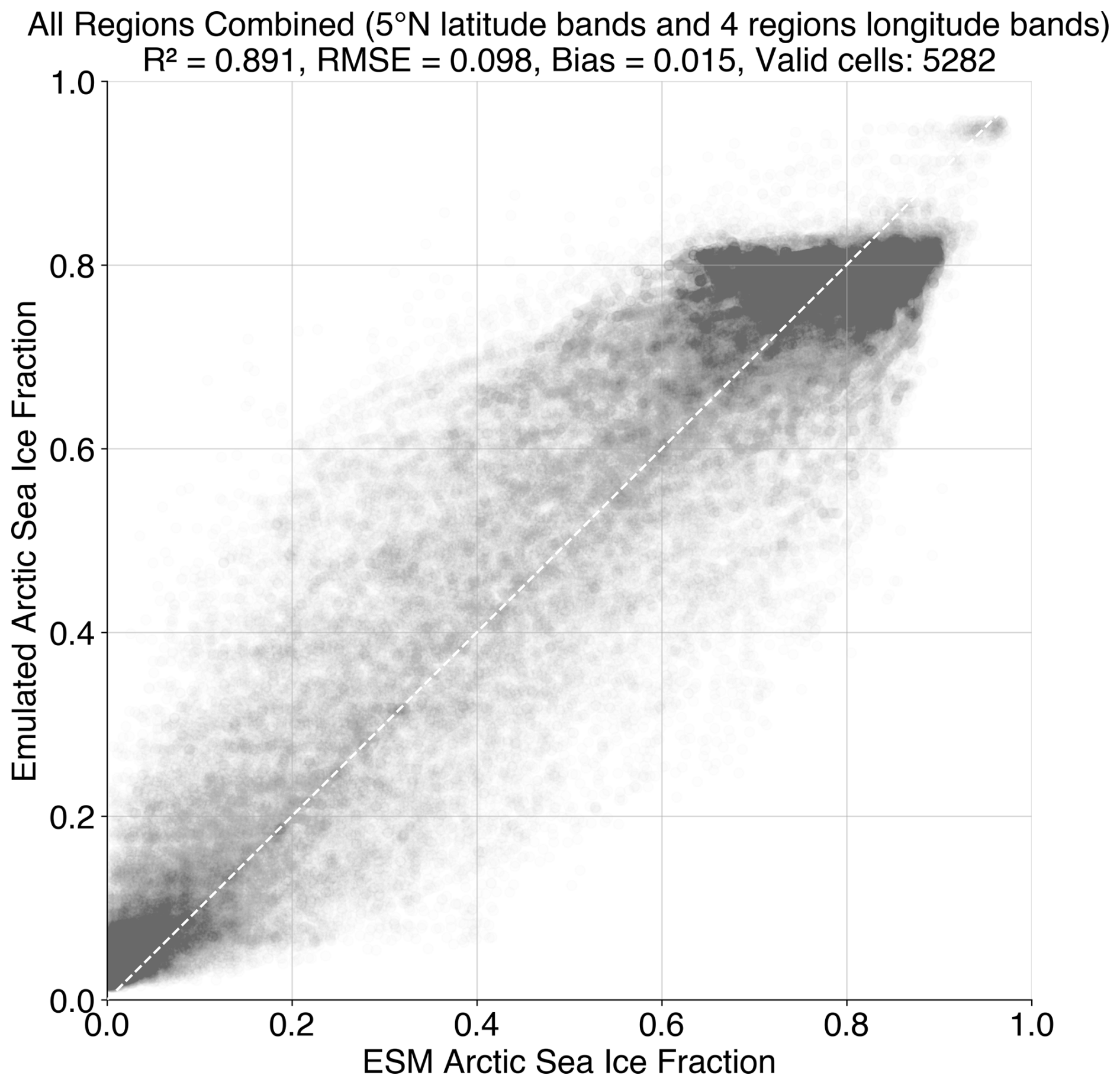 Figure A6Aggregated performance of sea ice emulation across all regions. Scatter plot comparing emulated September Arctic sea ice fraction (y axis) to CESM2-WACCM6 simulated values (x axis) for all grid cells and all 24 regions combined. Twenty years of annual values from 2050–2069 are shown. The dashed line represents the 1:1 relationship.