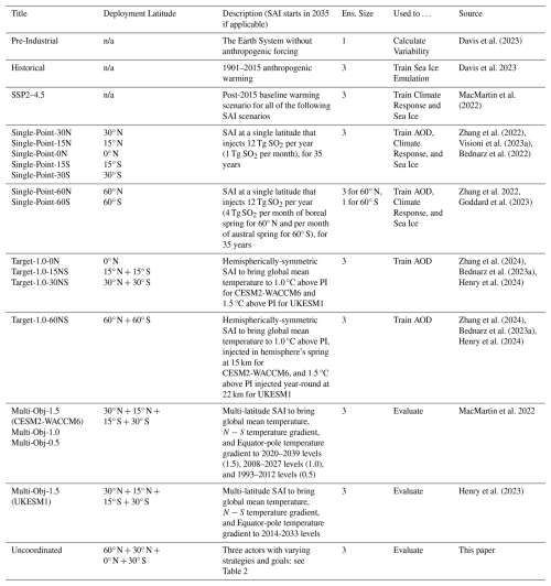 Table 1List of simulations used in this paper for both training and evaluating the emulator. Two Earth System Models are used for simulating: the Community Earth System Model version 2 with the Whole Atmosphere Community Climate Model version 6 (CESM2-WACCM6) and the U.K. Earth System Model (UKESM1). All simulations consist of a three member ensemble except for the Pre-Industrial and 60° S. n/a: not applicable