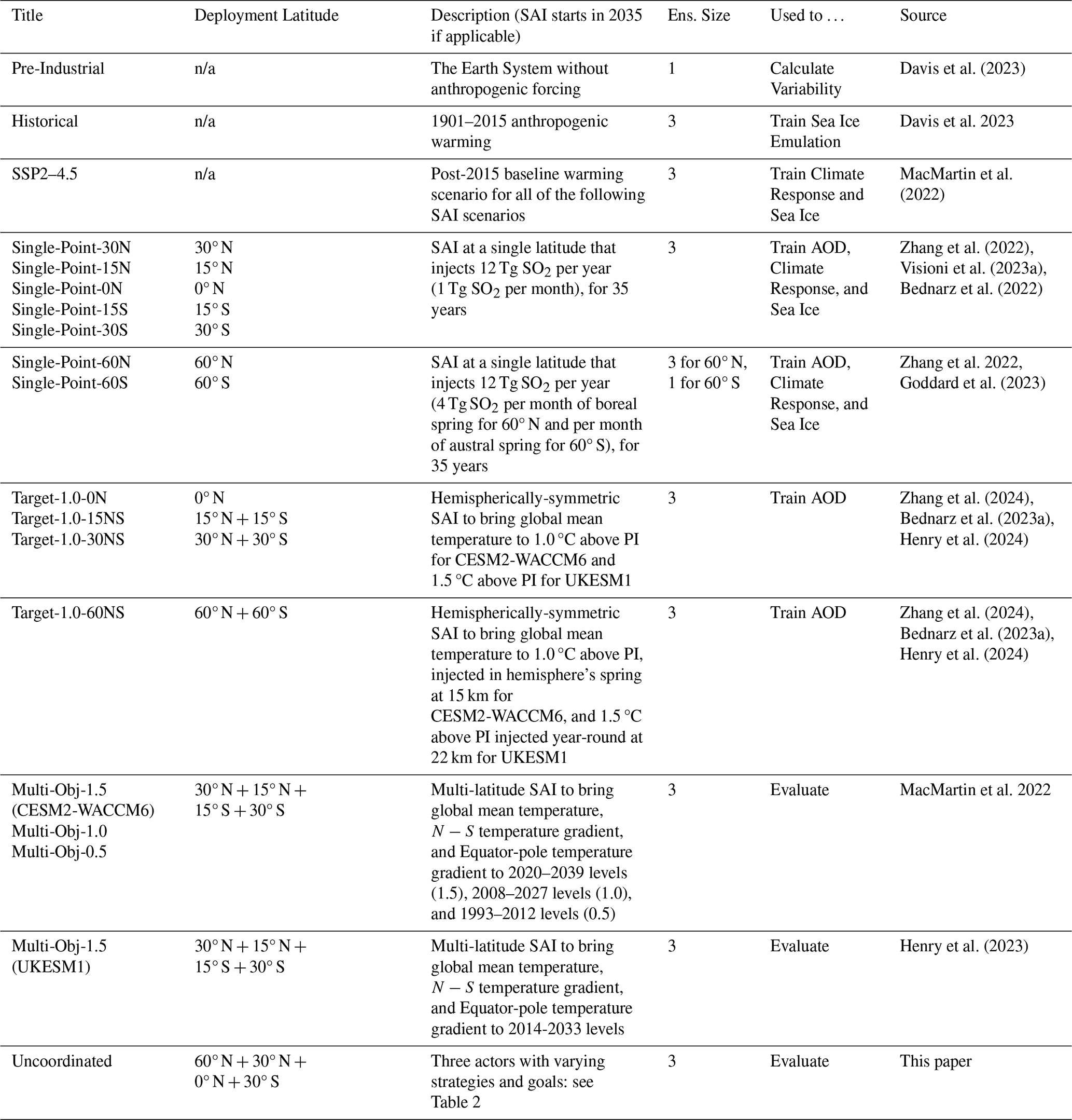 The climate resulting from a given deployment depends on the details of SAI realization, including location, magnitude of injection, and how these change over time. These factors, along with the background anthropogenic emissions, together define the scenario space for SAI. For the most part, these factors (e.g., latitude, magnitude, and temporal evolution) have been explored separately. There is now a significant body of research using climate models to examine the effects of injection at different latitudes (Tilmes et al., 2017; Dai et al., 2018; Visioni et al., 2023a, Bednarz et al., 2023b; Zhang et al., 2024; Henry et al., 2024), including estimating the number of meaningfully independent degrees of freedom (Zhang et al., 2022), designing strategies which fulfill multiple climate objectives at the same time (Kravitz et al., 2016, 2017; MacMartin et al., 2017; Lee et al., 2020; Tilmes et al., 2018; Richter et al., 2022; Henry et al., 2023), and optimizing over different goals (Brody et al., 2025). This research has largely looked only at the long-term response by averaging over several decades to examine its patterns. Scenarios have also explored the temporal dimension, including ramping up the injection rates over time to reach different temperature targets (Tilmes et al., 2020; MacMartin et al., 2022; Visioni et al, 2023b; Bednarz et al., 2023b) or non-steady targets (MacMartin et al., 2014; Keith and MacMartin, 2015, G6sulfur in Kravitz et al., 2015), changing the start date (Brody et al., 2024), and the effects of interruption, phase-out, or complete termination of deployment (Jones et al., 2013; Trisos et al., 2018; Farley et al., 2024). However, research on the temporal dimension of SAI deployment to this point has only considered a limited number of large-scale and long-term deployments.
