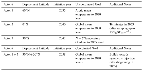 In this scenario, we have three actors deploying SAI, as detailed in Table 2; this includes (i) an actor injecting at 60°N to cool the Arctic, (ii) a second actor injecting at the equator to reduce global mean temperature, and (iii) a third actor in the Southern Hemisphere aiming to avoid disrupting tropical precipitation. This scenario is but one representative of the infinite design space of uncoordinated scenarios. In selecting this scenario, we make no claims regarding geopolitical plausibility or the likelihood of it occurring; rather, this scenario captures a number of relevant features unique to the space that may lead to interesting climate dynamics: