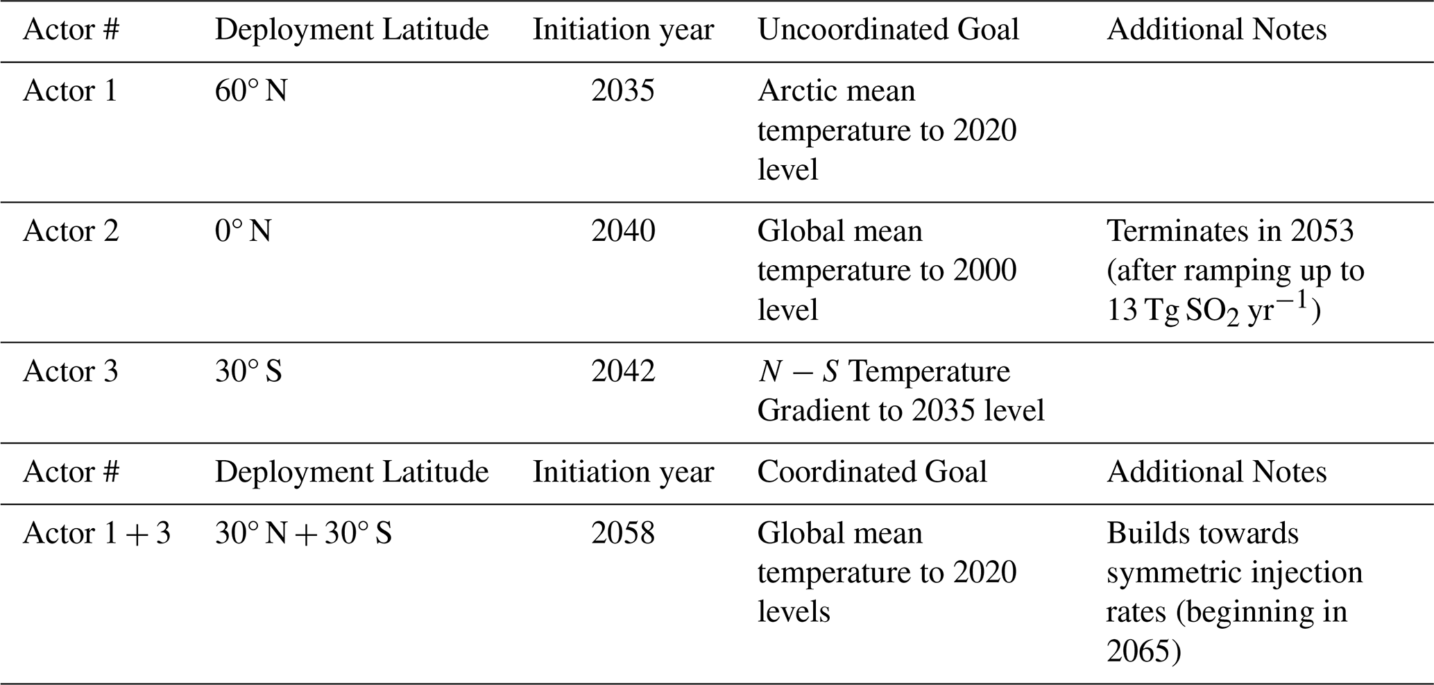 3. The actor wanting a balanced NS temperature gradient (for purposes of controlling the behavior of the Inter-Tropical Convergence Zone, see Kravitz et al., 2016) deploys in the hemisphere opposite to the Arctic actor but is delayed in their start.