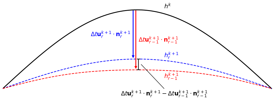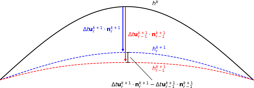 Figure 2Illustration of the displacement estimate that is the basis of the stabilization method used for implicit iterations. The arrows mark the displacement from hk to hk+1 in two different implicit iterations. The vertical bar measures the difference between the two arrows, which is the displacement between two implicit iterations.