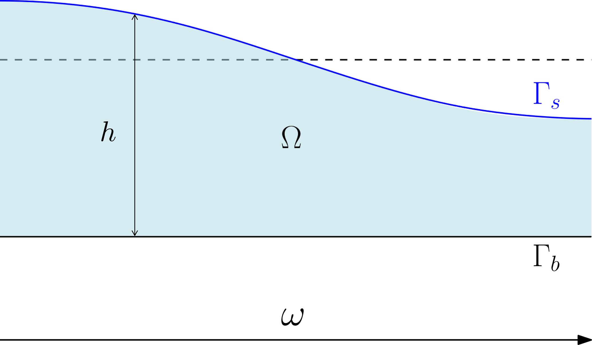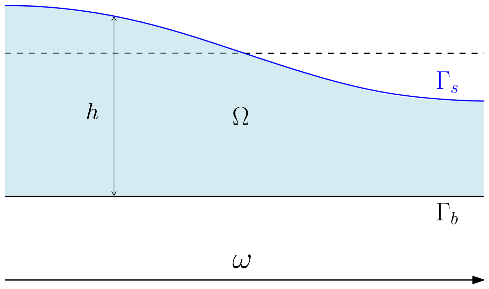 Figure 3Experimental setup. Outlined is the bulk domain Ω, the free-surface domain ω, the surface Γs, the height of the surface h, and the bedrock Γb. The surface will relax to the equilibrium configuration (black dashed line) as time progresses.