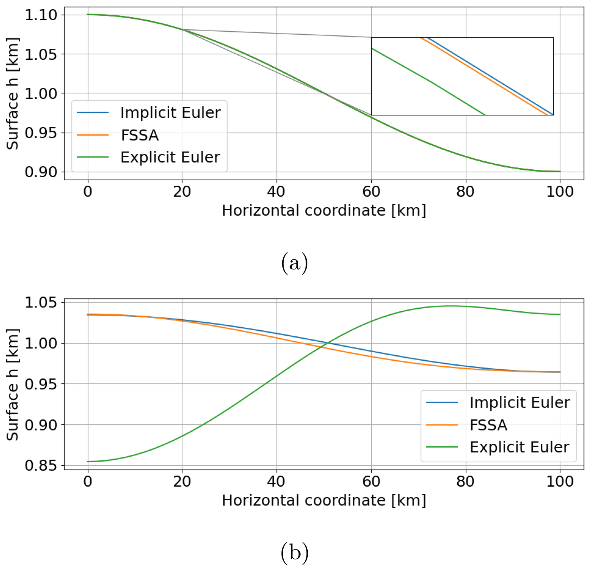 Figure 4Explicit Euler with (orange) and without FSSA (green), as well as the implicit solution (blue). The top panel (a) shows the solutions for a single small time-step of size Δt=0.01 years, for which all methods are stable. The inserted box is a zoom in around x=20, y=1.0808. The bottom panel (b) shows the solutions after one single large time step of size Δt=20 years for which the unstabilized Explicit Euler solution is unstable.