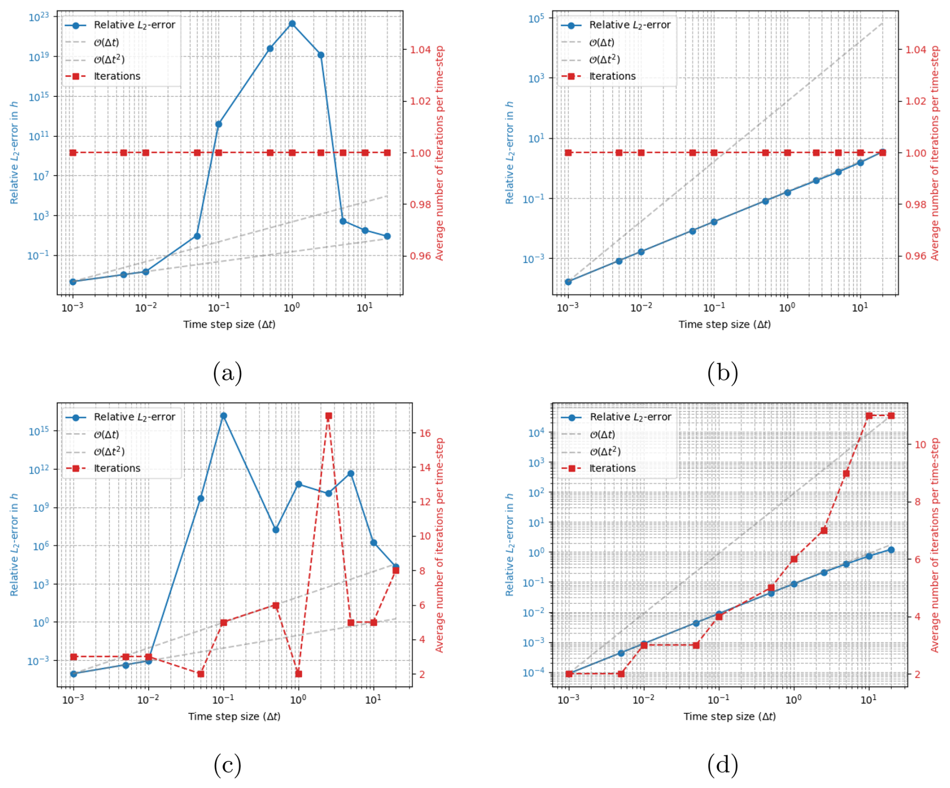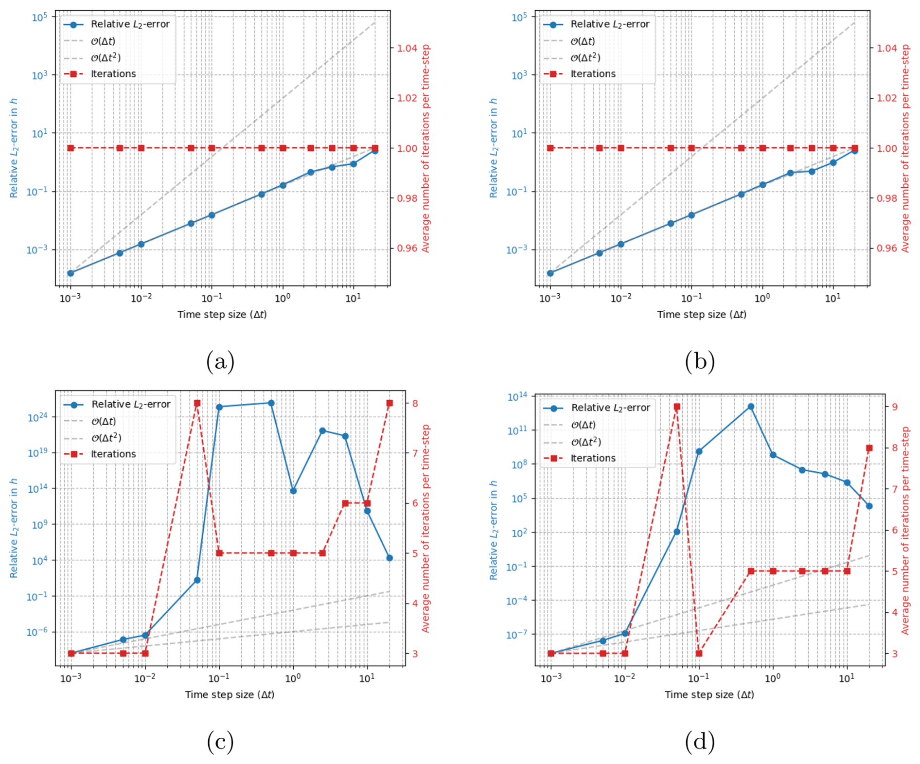 Figure 6Error in surface position h (in km) as computed with non-working “second order” schemes for different time-steps Δt (in years). Panel (a) and (b) shows results computed with Crank–Nicolson and BDF2 respectively, without implicit iterations, and FSSA is instead used to approximate un+1. Panel (c) and (d) shows results computed with Crank–Nicolson and BDF2 respectively, with implicit iterations but without stabilization. In panel (a) and (b) first order accuracy is seen, while second order accuracy is seen in panel (c) and (d) but only for very small time-steps. The reference solution is computed with Δt=0.00001 years and the final time is 20 years.