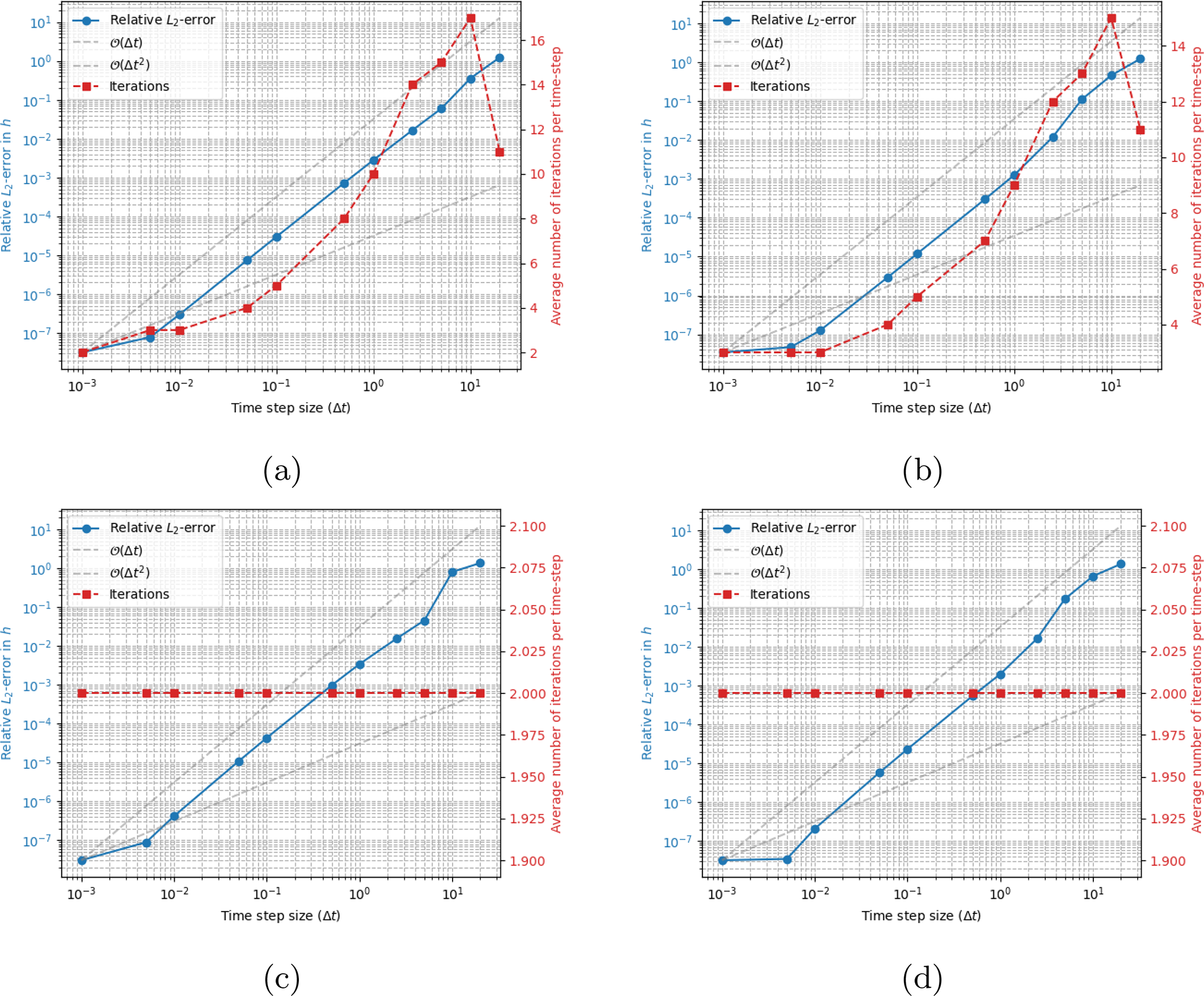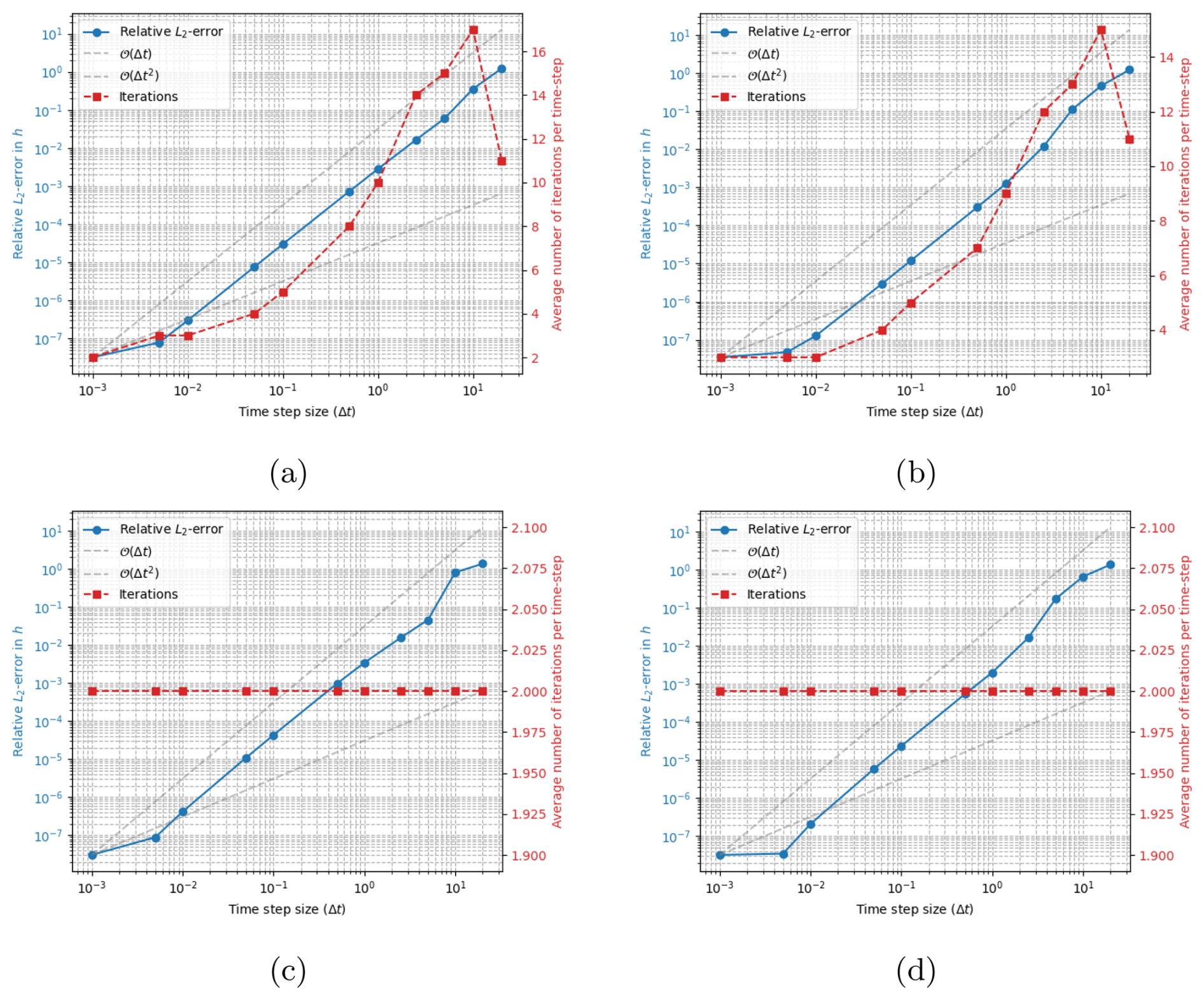 Figure 7Error in surface position h (in km) as computed with working second order schemes for different time-steps Δt (in years). All results are computed using the fully implicit solver stabilized with the subtraction-FSSA. Panel (a) and (b) shows results computed with Crank–Nicolson and BDF2 respectively, permitting a maximum of 100 implicit iterations per time step and with a convergence tolerance of . Panel (c) and (d) shows results computed with Crank–Nicolson and BDF2 respectively but only permitting a maximum of 2 implicit iterations and keeping the convergence tolerance at . The reference solution is computed with Δt=0.00001 years and the final time is 20 years.