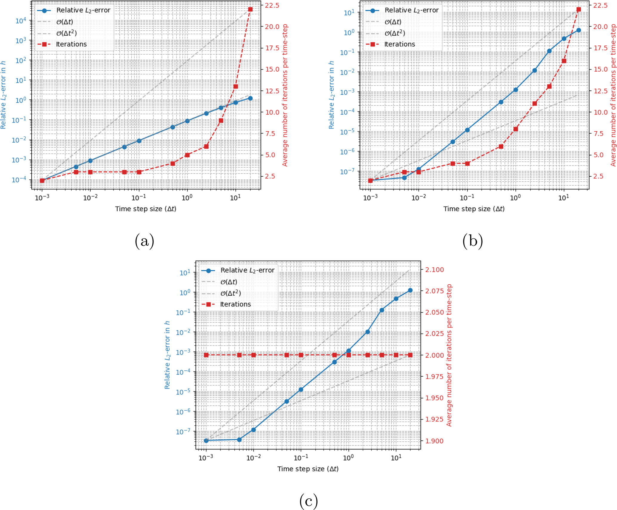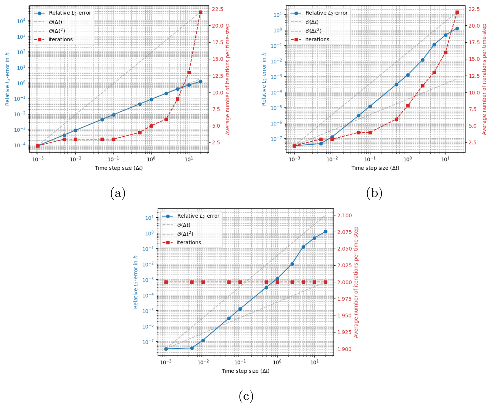 Figure 8Results computed using a fully implicit solver stabilzed by the simplified stabilization method of Eq. (21). Panel (a) and (b) shows results computed with BDF1 and BDF2 respectively, permitting a maximum of 100 implicit iterations per time-step. The results of panel (c) are computed using BDF2 but only permitting a maximum of 2 implicit iterations per time-step. The convergence tolerance is in all simulations. As with the exact stabilization of Eq. (19), 2 coupled iterations are enough to reach second order convergence. The reference solution is computed with Δt=0.00001 and the final time is 20 years.