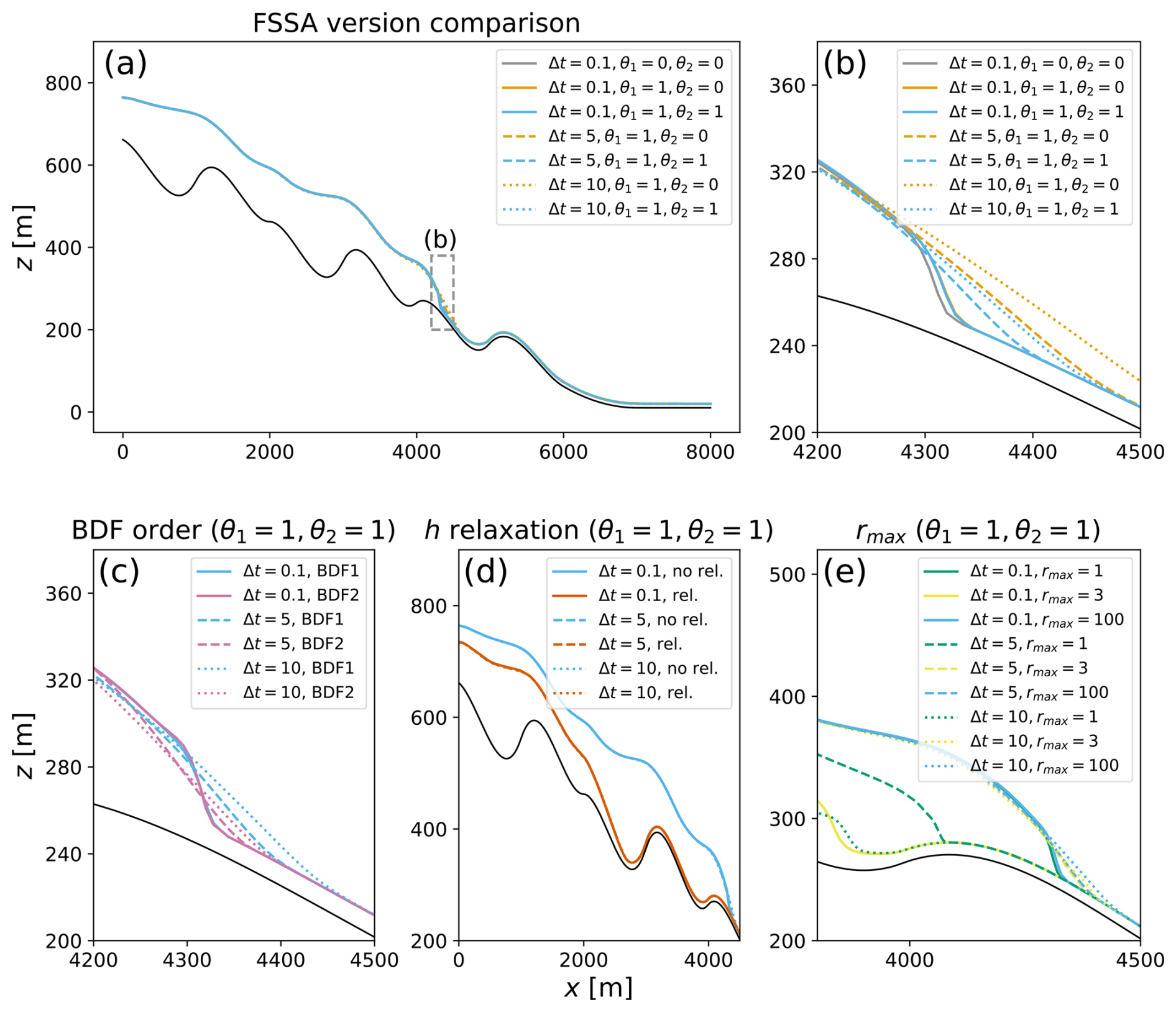 Figure 9The surface elevation, h, of the Perlin glacier after a 400-year simulation, with varying parameters. Panels (a) and (b) show the surface elevation computed with BDF1 across the time step sizes 0.1, 5 and 10 years with subtraction-FSSA and the original FSSA formulation, along with the reference simulation with no FSSA stabilization. Panel (c) shows a comparison between BDF order 1 and 2 across simulations with time step sizes of 0.1, 5 and 10 years, all of which include the subtraction-FSSA. Panel (d) shows simulations with time step sizes of 0.1, 5 and 10 years with and without relaxation of the free-surface solver. Lastly, panel (e) shows the surface elevation with and without coupled iterations for time step sizes of 0.1, 5 and 10 years. Across all figures, the black line indicates the bed elevation.