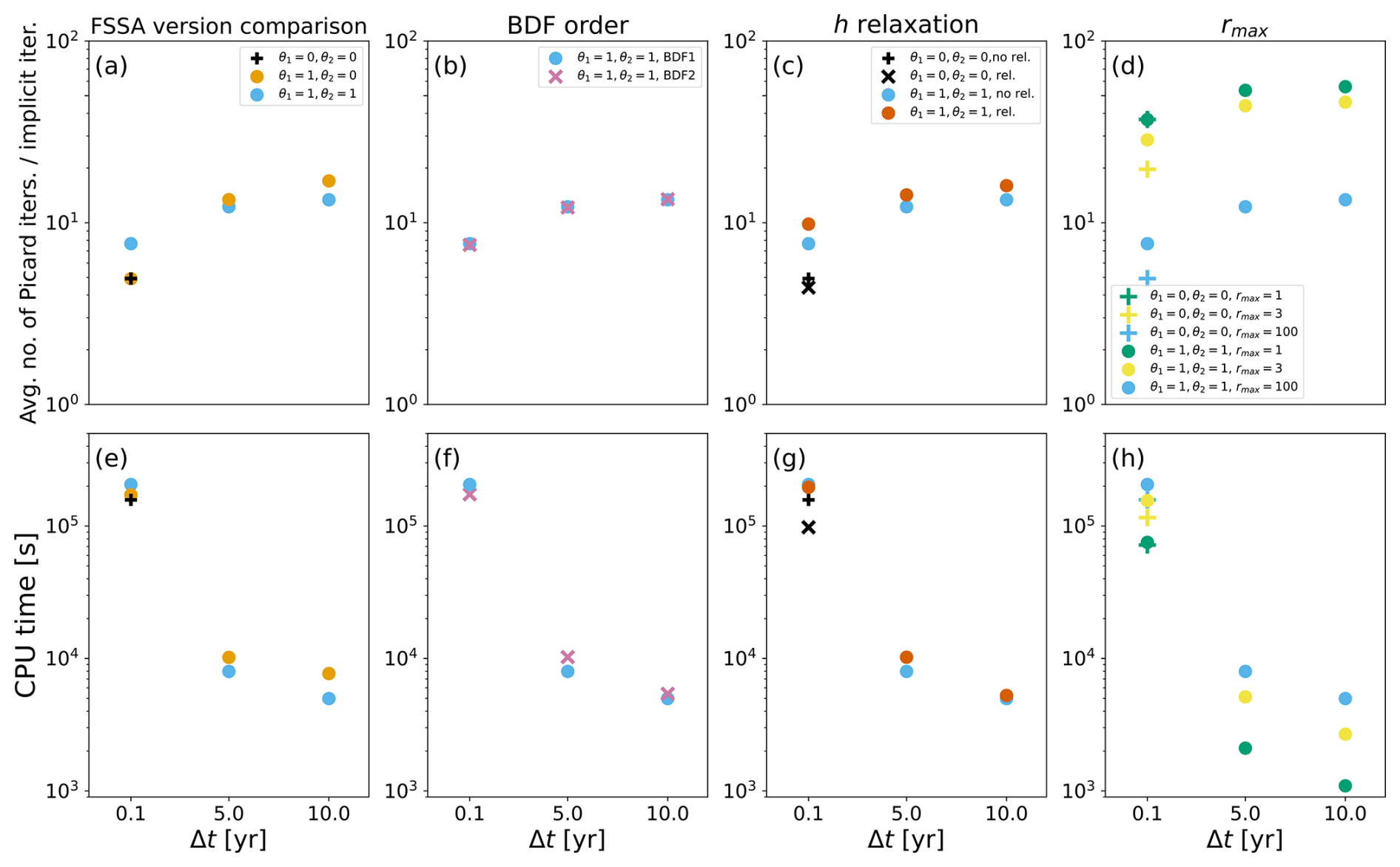 Figure 10The top panels show the average number of Picard fixed point iterations per implicit iteration, and the bottom panels show the CPU time for the same simulations as in Fig. 9. Panels (a) and (e) illustrate the effect of the FSSA formulation (subtraction-FSSA, , the original FSSA θ1, θ2=0 and no FSSA, ) across the time step sizes 0.1, 5 and 10 years. These simulations are performed with BDF1 and rmax=100, and with no surface relaxation. Panels (b) and (f) illustrate the effect of the BDF order in simulations with rmax=100, no surface relaxation and subtraction-FSSA stabilization applied. Panels (c) and (g) illustrate the effect of surface relaxation in simulations with BDF1, rmax=100, with and without subtraction-FSSA. Lastly, panels (d) and (h) show the effect of the maximum allowed implicit iterations rmax, in simulations with BDF1, rmax=100, with and without subtraction-FSSA.