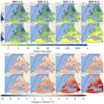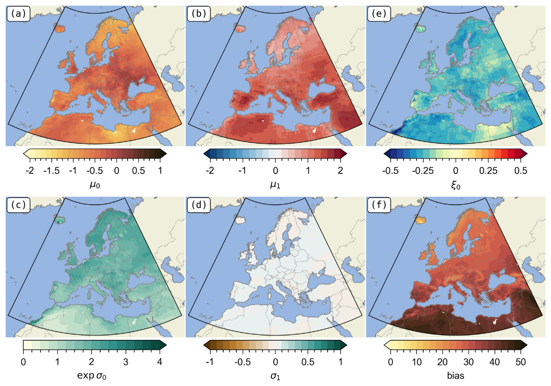 We have also represented the estimates of as pairs between μ0 and the other parameters μ1, σ0, σ1 and ξ0, in Fig. 3e–h. These estimates are represented with the ellipse defined by the covariance matrix at the 95 % level, in grey. We can see that the parameter μ1, which drives the average trend of extremes, ranges from a value of almost zero in some models to a factor of 4. The equivalent parameter for scale, σ1, is centred at 0. The shape parameter ξ0 is strictly negative regardless of the model, which is typical for temperatures. Note that the model with the lower μ0, which differs from the other climate models, is the NorESM2-LM model (Norwegian Bentsen et al., 2019).
