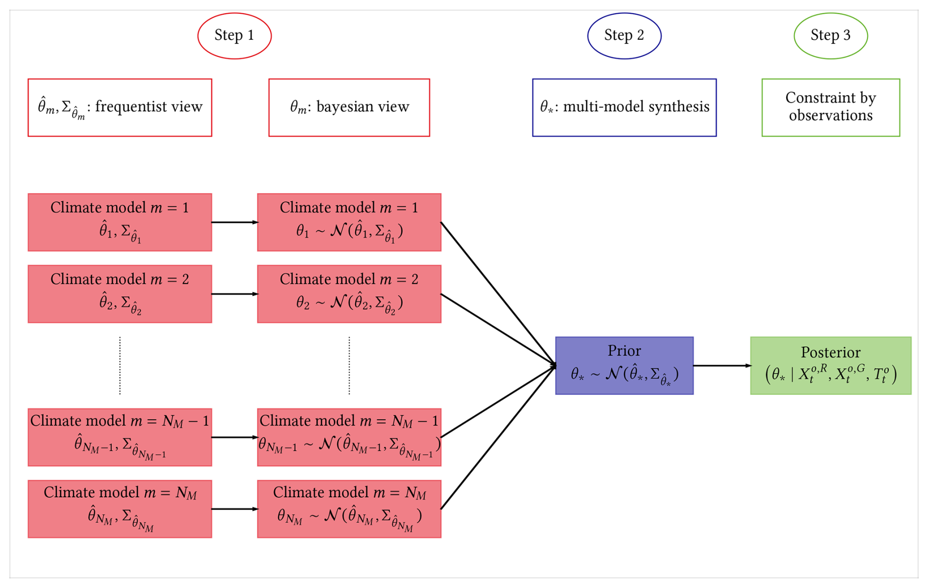 Construction of the multi-model synthesis. At this stage, we switch to a Bayesian approach. The vector θm is now considered a random variable for each climate model , for which we seek to estimate the probability distribution ℙ(θm). Since we have an estimate and a covariance matrix , the multivariate normal distribution is the natural choice: