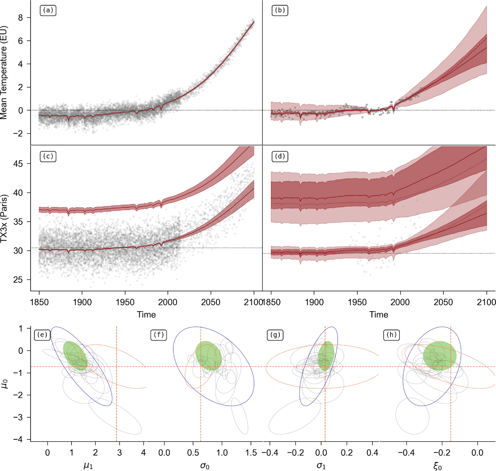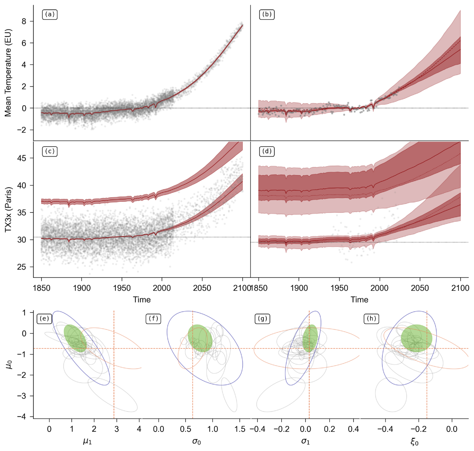 Figure 3Illustration of the methodology described in Sect. 3. (a) Mean forcing (red line) for the Europe covariate of the IPSL model (grey dots), for the SSP5-8.5 scenario. The 95 % confidence interval is given by the solid red area. (b) Multi-model synthesis (light red) and posterior (dark red) after constraint by observations (in grey) for the Europe covariate, for the SSP5-8.5 scenario. (c) TX3x series in Paris from the IPSL model (grey dots) for the SSP5-8.5 scenario. The red line passing through the model data is the median, with its 95 % confidence interval (filled area). The red line above the data is the upper bound, also with its 95 % confidence interval. (d) Same as (c), for the prior (multi-model synthesis, in light red) and the posterior (constrained by observations, in dark red). The grey dots are observations from ERA5. (e) Parameters μ1 as a function of μ0 for climate models (in grey), the multi-model synthesis (in blue), the posterior after constraint (in green), and the direct estimate from observations (orange). The ellipses represent the 95 % confidence interval for the pair of parameters. The parameters are those estimated in Paris. (f) Same as (e), for σ0 as a function of μ0. (g) Same as (e), for σ1 as a function de μ0. (h) Same as (e), for ξ0 as a function de μ0.