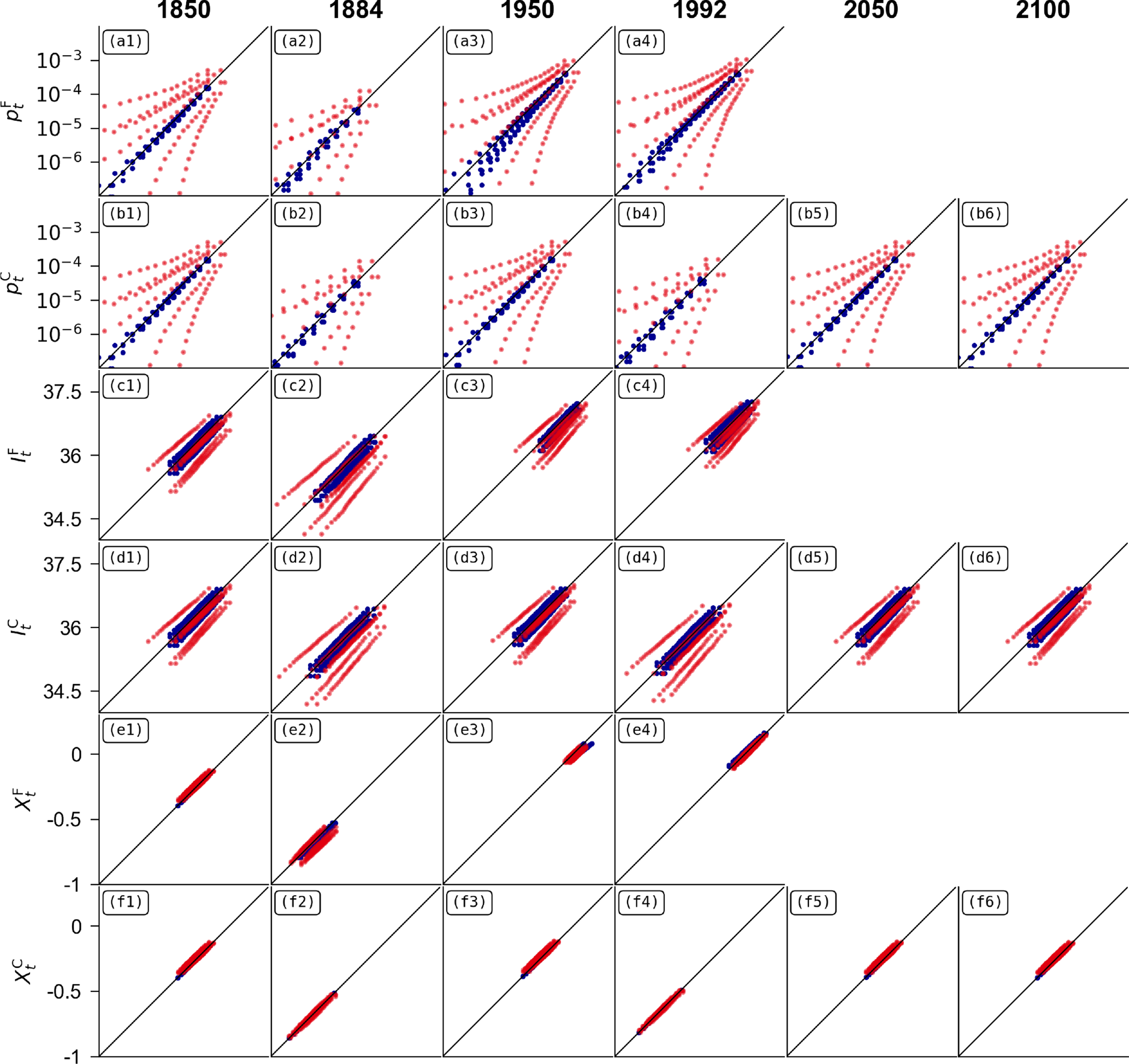 Let us begin with the probabilities and , lines a and b. In the counterfactual world in the case of joint scenarios (blue values), the quantile-quantile diagrams are almost perfectly aligned on the diagonal, showing that the data distributions of the four scenarios are indeed the same. In the case where the scenarios are handled separately (in red) in the counterfactual world, the values are much more dispersed, showing a significant deviation between the different counterfactuals. In the factual world, the results are similar in 1850 and 1884, but the dispersion around the diagonal of the dependent case is greater in 1950 and 1992, due to the influence of the scenarios. The scenarios are not supposed to intervene at these points in time (in CMIP6, the SSPs begin in 2015), but inference on the complete series makes the smoothed values of the historical part partially dependent on the values of the part where the scenarios intervene.