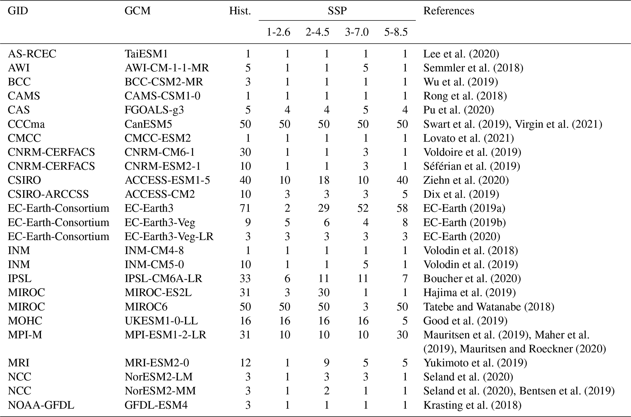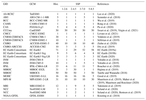 Lee et al. (2020)Semmler et al. (2018)Wu et al. (2019)Rong et al. (2018)Pu et al. (2020)Swart et al. (2019)Virgin et al. (2021)Lovato et al. (2021)Voldoire et al. (2019)Séférian et al. (2019)Ziehn et al. (2020)Dix et al. (2019)EC-Earth (2019a)EC-Earth (2019b)EC-Earth (2020)Volodin et al. (2018)Volodin et al. (2019)Boucher et al. (2020)Hajima et al. (2019)Tatebe and Watanabe (2018)Good et al. (2019)Mauritsen et al. (2019)Maher et al. (2019)Mauritsen and Roeckner (2020)Yukimoto et al. (2019)Seland et al. (2020)Seland et al. (2020)Bentsen et al. (2019)Krasting et al. (2018)For each model (see Table 1) we take the same variables as for the observations: TX3x on each European grid point, mean annual temperature over Europe, and over the world. These variables cover the period from 1850 to 2100, thus including the historical part as well as the future projections of the four SSPs scenarios described above.