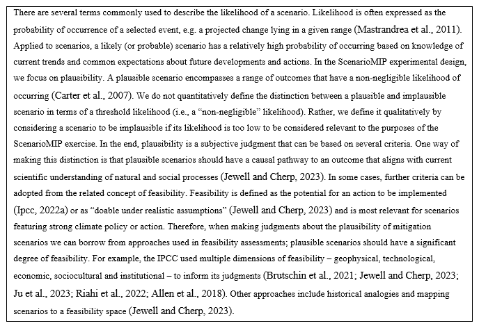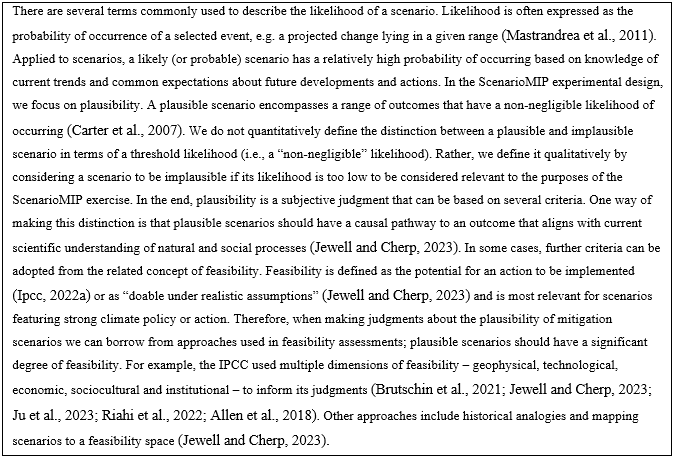 Plausibility is a subjective judgment. Moreover, in several cases our plausibility judgments are conditional on assumptions that are themselves hypothetical. For example, in all scenarios we assume that there are no climate change impacts (see further in this document). This can be justified by the overall scenarios framework in which impact analyses will be carried out by impact models using ScenarioMIP ESM simulations (and human drivers) as inputs. In other words, the ScenarioMIP scenarios are judged to be plausible conditional on the assumption of no climate change impacts. This conditionality is most consequential for the high climate change scenarios, in which impacts would be largest. The medium scenarios make subjective assumptions on current policies (see further). For low scenarios, we take into account geophysical and techno-economic limits, particularly regarding ramp-up rates of emission reduction and CDR, and technology and policy trends/constraints in the short-run. Views on plausibility evolve over time, as evidenced by the changing scenarios assumptions in successive IPCC WGIII assessment reports. It should therefore be acknowledged that there might be potential futures outside the ScenarioMIP scenario range.