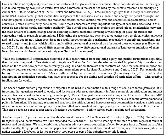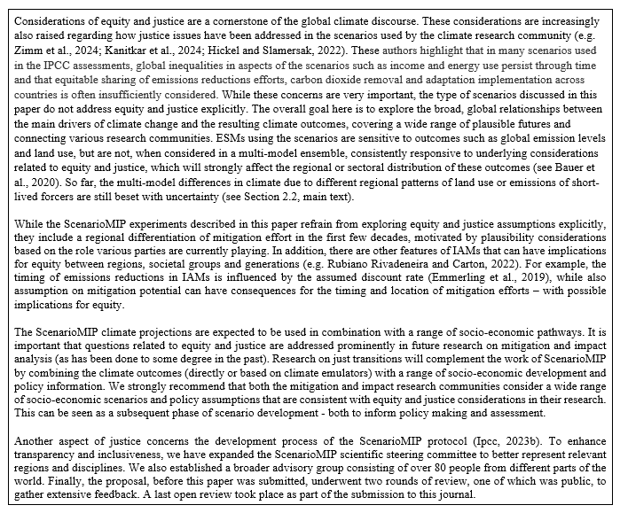 Considerations of equity and justice are a cornerstone of the global climate discourse. These considerations are increasingly also raised regarding how justice issues have been addressed in the scenarios used by the climate research community (e.g. Zimm et al., 2024; Kanitkar et al., 2024; Hickel and Slamersak, 2022). These authors highlight that in many scenarios used in the IPCC assessments, global inequalities in aspects of the scenarios such as income and energy use persist through time and that equitable sharing of emissions reductions efforts, carbon dioxide removal and adaptation implementation across countries is often insufficiently considered. While these concerns are very important, the type of scenarios discussed in this paper do not address equity and justice explicitly. Their overall goal is to explore the broad, global relationships between the main drivers of climate change and the resulting climate outcomes, covering a wide range of plausible futures and connecting various research communities. ESMs using the scenarios are sensitive to outcomes such as global emission levels and land use, but are not, when considered in a multi-model ensemble, consistently responsive to underlying considerations related to equity and justice, which will strongly affect the regional or sectoral distribution of these outcomes (see Bauer et al., 2020). So far, the multi-model differences in climate due to different regional patterns of land use or emissions of short-lived forcers are still beset with uncertainty (see Sect. 2.2, main text).