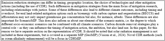 Another aspect of justice concerns the development process of the ScenarioMIP protocol (IPCC, 2023b). To enhance transparency and inclusiveness, we have expanded the ScenarioMIP scientific steering committee to better represent relevant regions and disciplines. We also established a broader advisory group consisting of over 80 people from different parts of the world. Finally, the proposal, before this paper was submitted, underwent two rounds of review, one of which was public, to gather extensive feedback. A last open review took place as part of the submission to this journal.