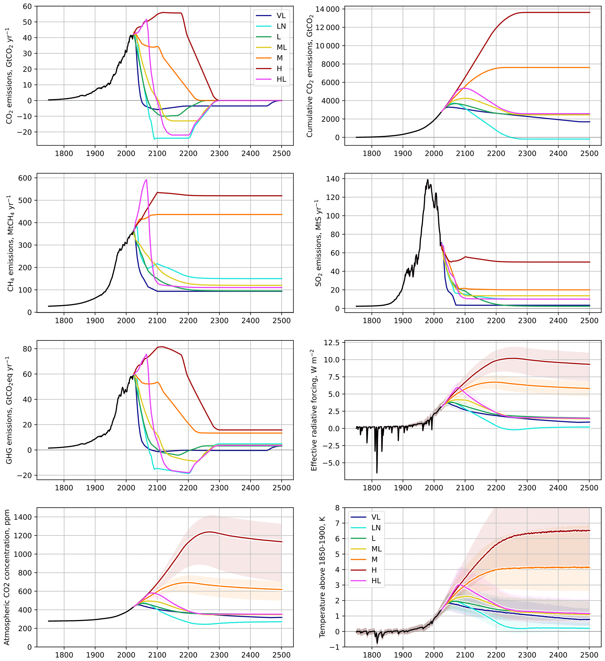 Gidden, M. J., Riahi, K., Smith, S. J., Fujimori, S., Luderer, G., Kriegler, E., van Vuuren, D. P., van den Berg, M., Feng, L., Klein, D., Calvin, K., Doelman, J. C., Frank, S., Fricko, O., Harmsen, M., Hasegawa, T., Havlik, P., Hilaire, J., Hoesly, R., Horing, J., Popp, A., Stehfest, E., and Takahashi, K.: Global emissions pathways under different socioeconomic scenarios for use in CMIP6: a dataset of harmonized emissions trajectories through the end of the century, Geosci. Model Dev., 12, 1443–1475, https://doi.org/10.5194/gmd-12-1443-2019, 2019.