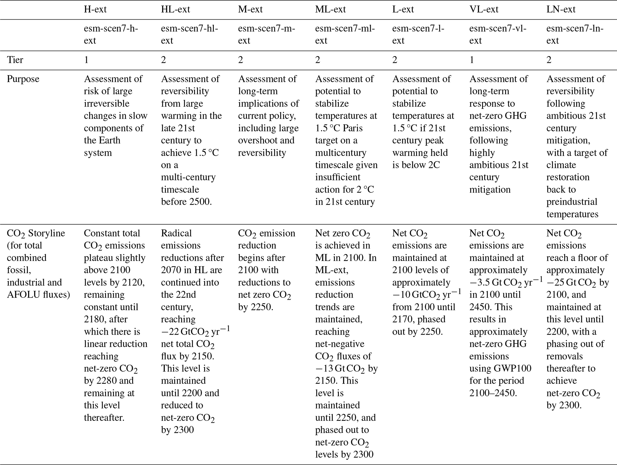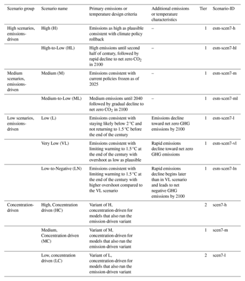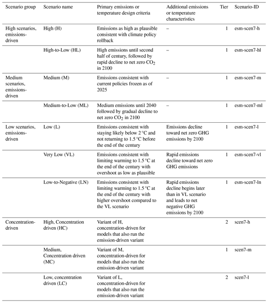 Table 1Scenarios, naming, key design criteria, and their priority (expressed as Tier 1 and 2). These priorities are meant to be for models participating in emission-driven mode. We also request that these groups run, as part of Tier 1, the Medium scenario in concentration driven mode in order to distinguish the effects of the active carbon-cycle on the outcomes. Two more scenarios in concentration driven mode for these models are part of Tier 2. All the scenarios listed here will be provided also as concentrations for models that want to run ScenarioMIP in concentration mode, and for which Tier 1 will include all 7 scenarios. If run concentration driven, the scenario-ID is the current name without the prefix “esm-”.
