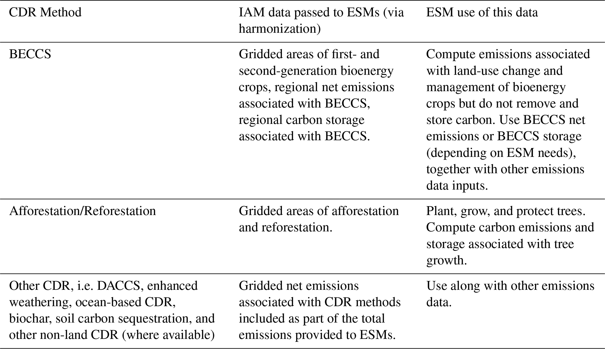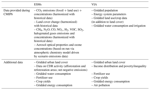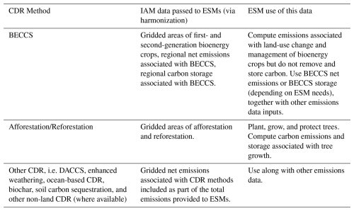 Concentration data will also be provided for all scenarios for ESMs that can only run in concentration-driven mode (without an active carbon cycle; see for a discussion of the current capabilities of state-of-the-art ESMs (Hajima et al., 2025; Séférian et al., 2020). For the concentration-driven simulations, the median values of the concentrations as estimated by the carbon cycle emulators calibrated to CMIP6 included in Simple Climate Models (SCMs) can be used (Nicholls et al., 2025b). This means that the concentration-driven models will likely have a narrower outcome space compared to the emission-driven set, which will have consequences for interpretation and use of certain variables. Regarding CDR options, only afforestation and reforestation will be based on endogenous representation of land use in ESMs. For all other CDR options, we will include their emission impact within the IAM emission output (see Sect. 5). To better assess the impact of running in emission-driven mode over the range of climate system outcomes produced by the multi-model ensemble, we propose that modeling groups adopting the emission-driven mode also run at least one scenario in concentration-driven mode, for comparison.