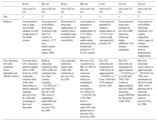 Note that all scenarios are named after emission trends. The global mean temperature associated with these scenarios will be determined by ESM experiments and will form a range of outcomes. The temperature levels discussed above only guide the scenario design and are being assessed during the design phase using SCMs. The overall logic of the current design shares key characteristics with the proposal of Meinshausen et al. (2024). A summary of the scenario definitions is given in Table 1 while Fig. 1 illustrates the potential outcomes, based on preliminary results from IAMs and an SCM. In Sects. 3, 4 and 5 we further explore ideas and considerations relevant to the various scenarios.